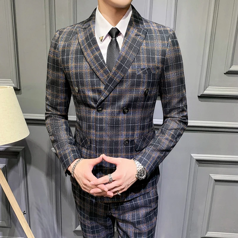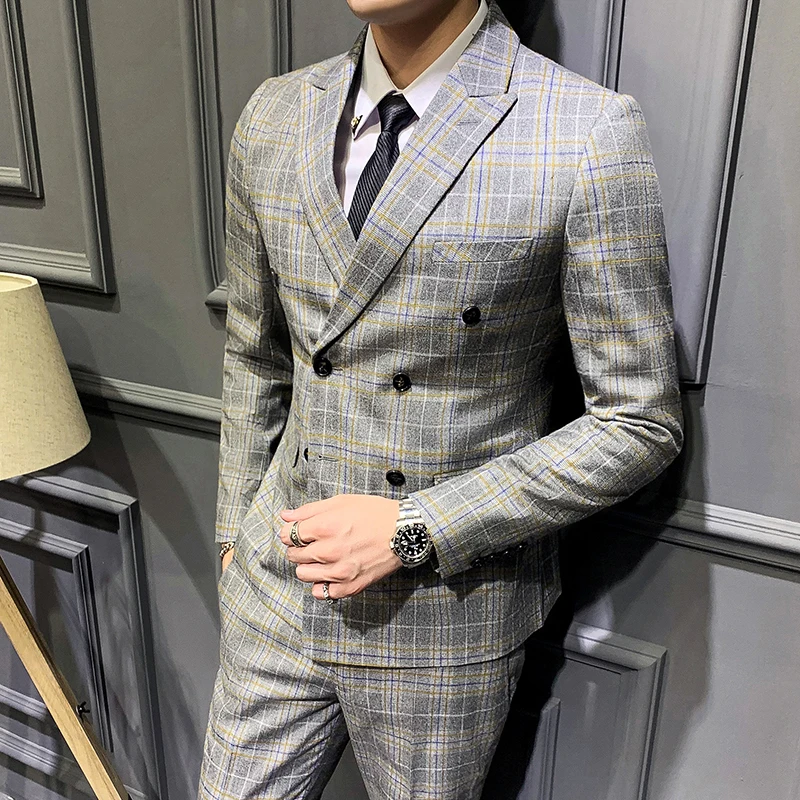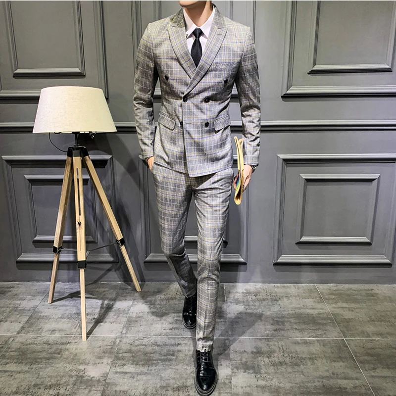 Мужской свадебный костюм-тройка, черный, серый, синий, в клетку, приталенный, двубортный, Q763, 2019
