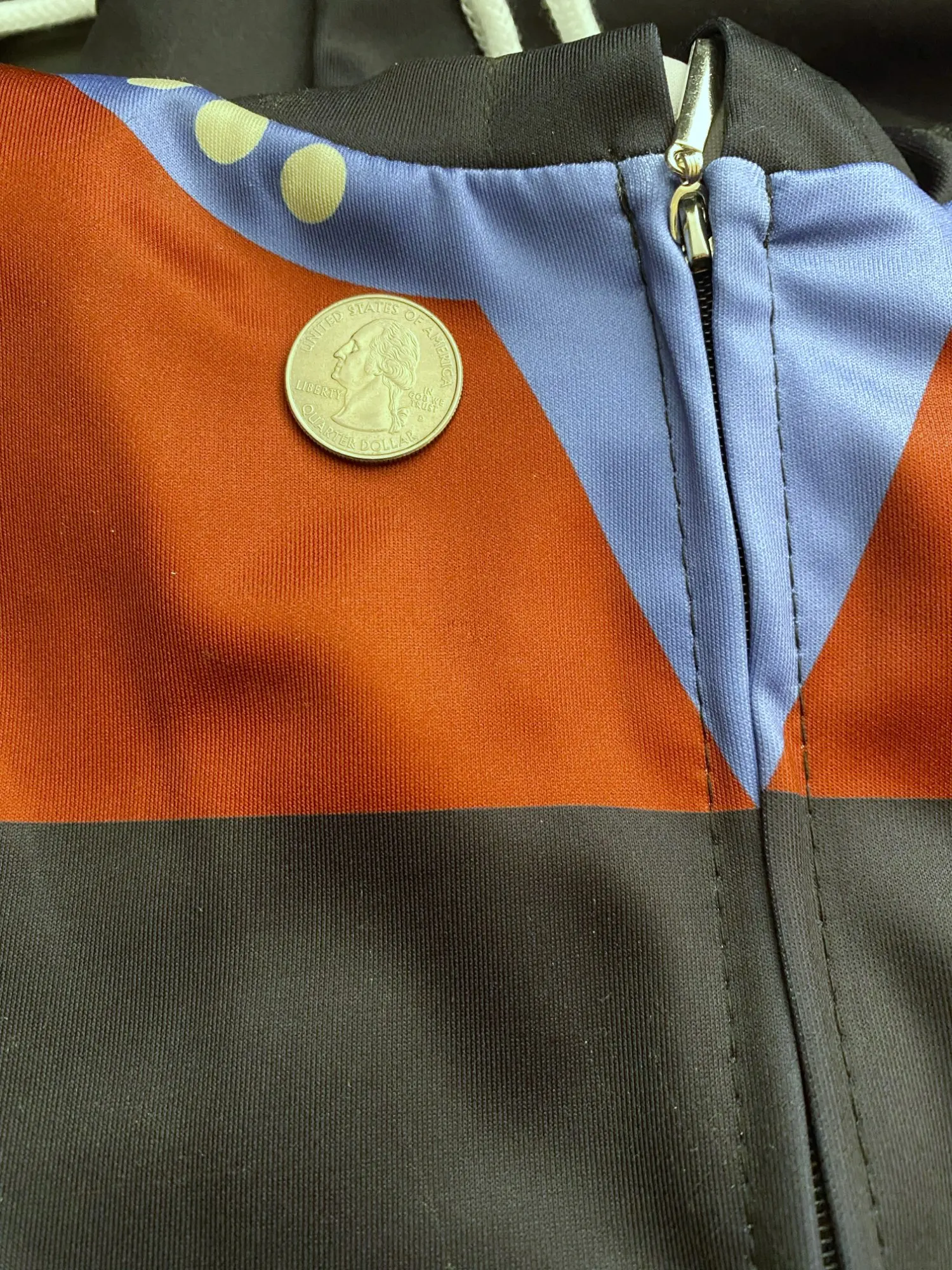 Размер 5XL здесь выглядит как размер US XL или Размер 2XL. Он находится на блестящей стороне и не выложен каким-либо образом. Характеристики хорошо видны и будут использоваться в качестве легкой куртки. (Я в S. Calif.) ткань тонкая, поэтому не ожидайте тепла, кроме самой ткани. Я планирую использовать свой собственный значок и пипсы для дополнительной глубины худи. Идеально подходит для любого Voyager/Janeway вентилятора!