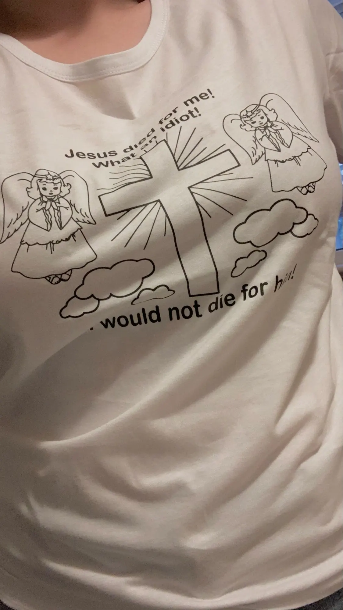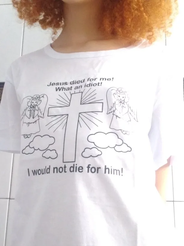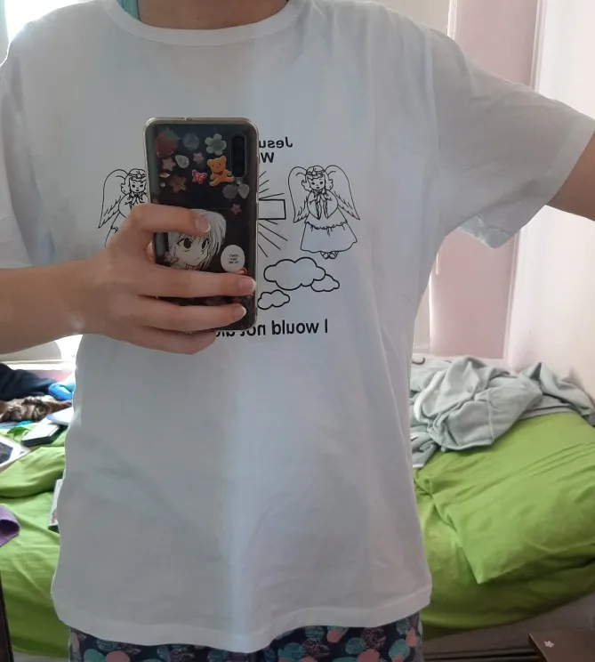 Очень хорошая рубашка! Нижняя сторона заключается в том, что при поступлении он пахнет плохо, а вырез на шее был странным, довольно хороший! Буду носить в церковь, чтобы разозлить людей lol owo