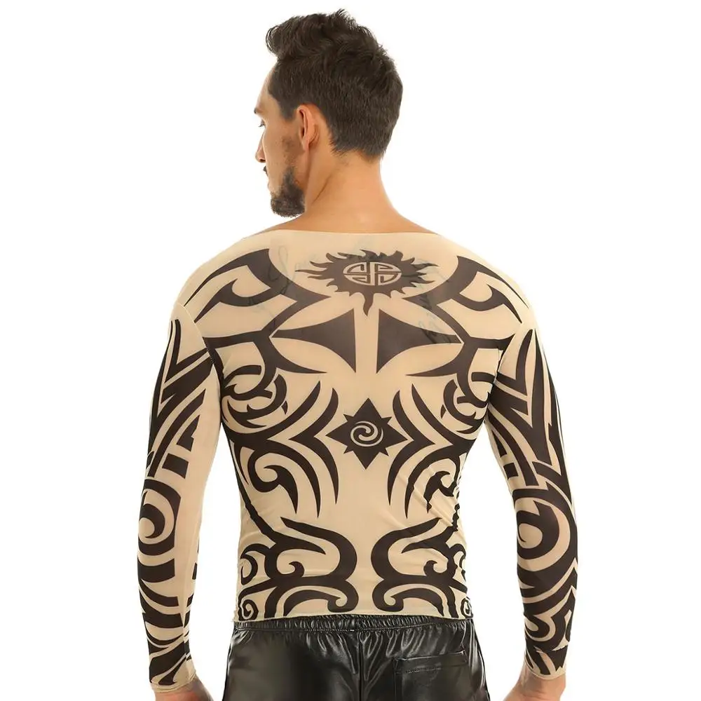 Мужские тату-футболки с круглым вырезом, прозрачные с длинным рукав...
