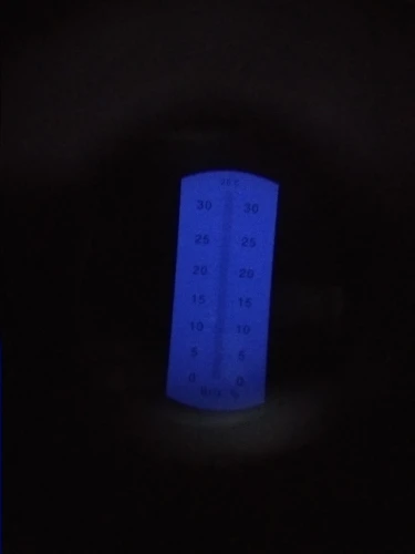 налил воды показало 0. размешал в 100 гр воды 10гр сахара - показало 10%. при добавлении спирта показания увеличиваются. покупкой доволен.