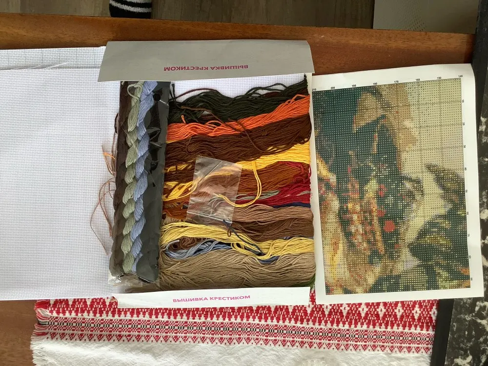 Товар соответствует описанию. Доставка ровно месяц в Украину. В наборе нитки, канва, схема цветная и игла. Рекомендую.