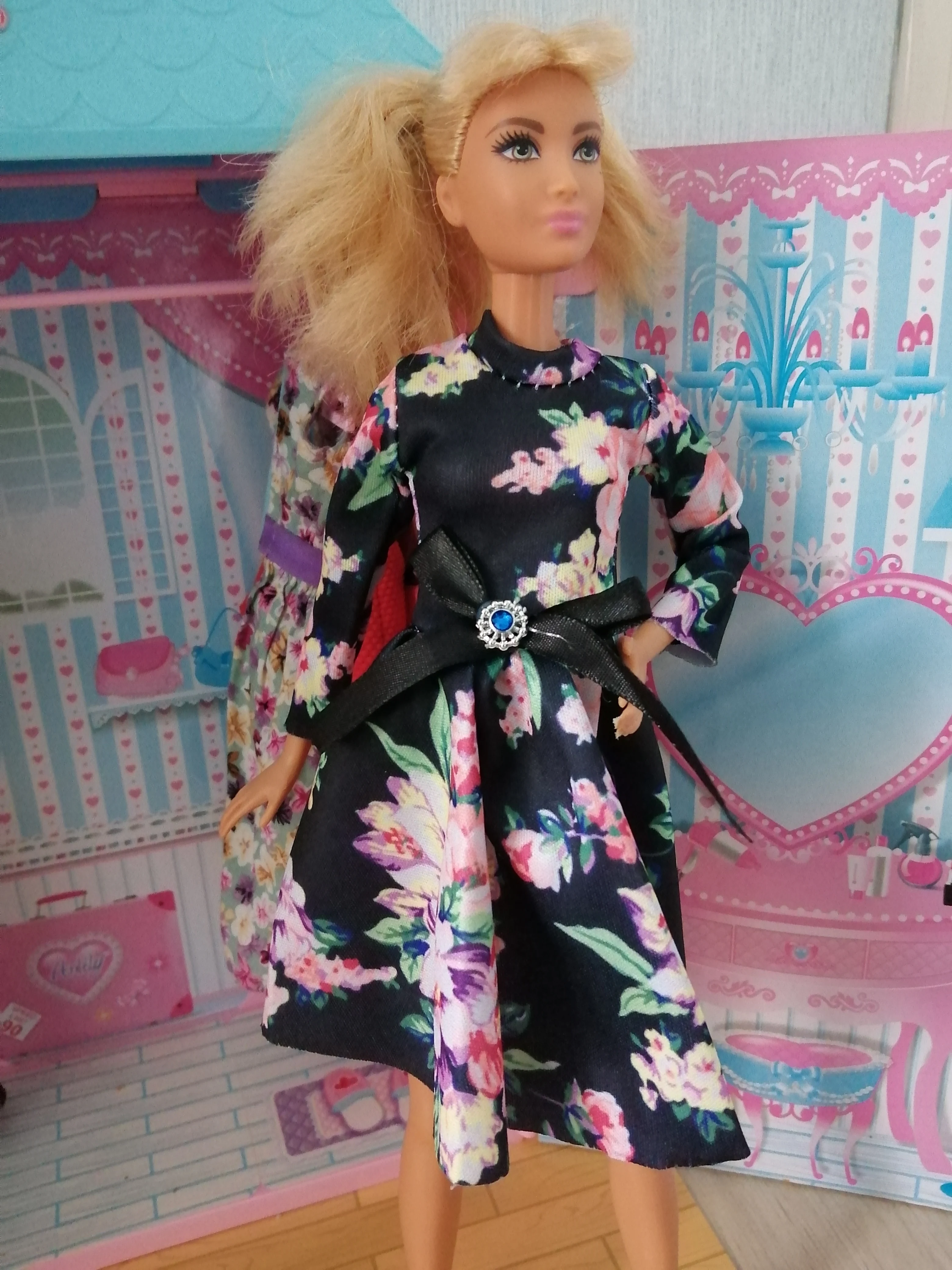 Полностью соответствует описанию, красивое платье. Бантик с пояса я отклеила, так оно смотрится строже. Материал приятный, руки барби легко продеваются в рукава. На спине липучка.