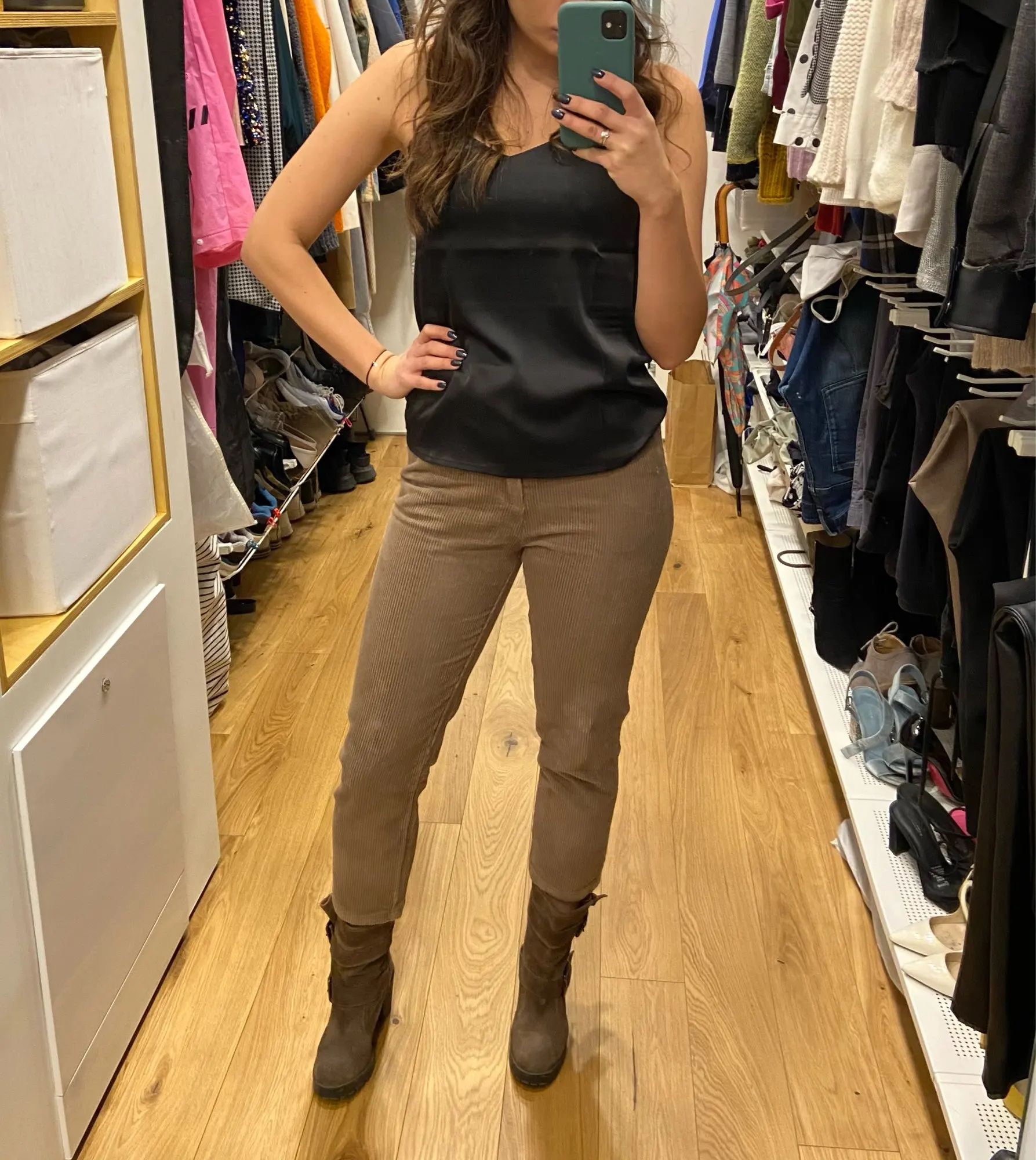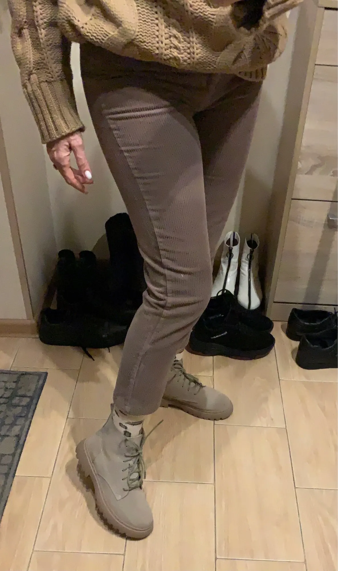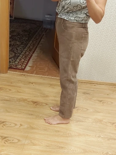 Штанишки пришли быстро, без брака, без запаха. Угадала с размером. Рост 164, вес 60, ОТ 70, ОБ 96. Мою фигуру прямоугольник даже вытягивают. Сели по попе плотненько, но я так люблю. Модель укороченная, но это при заказе это было понятно. Цвет очень приятный, рубчик у вельвета средний. Чуть-чуть пружинят в ширину.