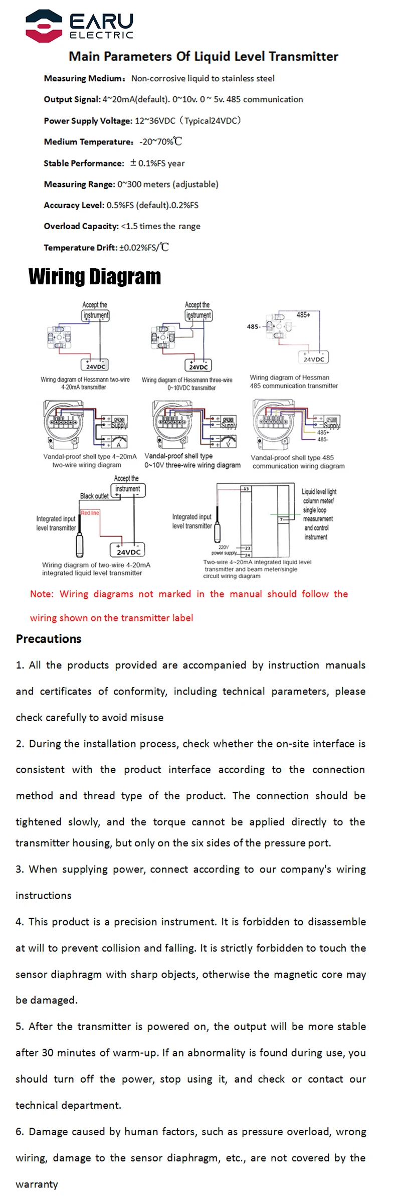 Передатчик уровня ввода/уровня воды использует диффузионный кремниевый чип для инкапсуляции диффузионного силиконового масляного сердечника в корпусе из нержавеющей стали. Передняя защитная крышка функционирует как защитная сенсорная диафрагма, а также позволяет жидкости плавно контактировать с диафрагмой. Провод и корпус герметичны и подключены. Вентиляционная труба подключается к внешней стороне кабеля. Внутренняя структура предназначена для предотвращения конденсации. Встроенная микросхема обработки сигнала используется для дистанционной передачи. Он имеет хорошую стабильность и надежность.