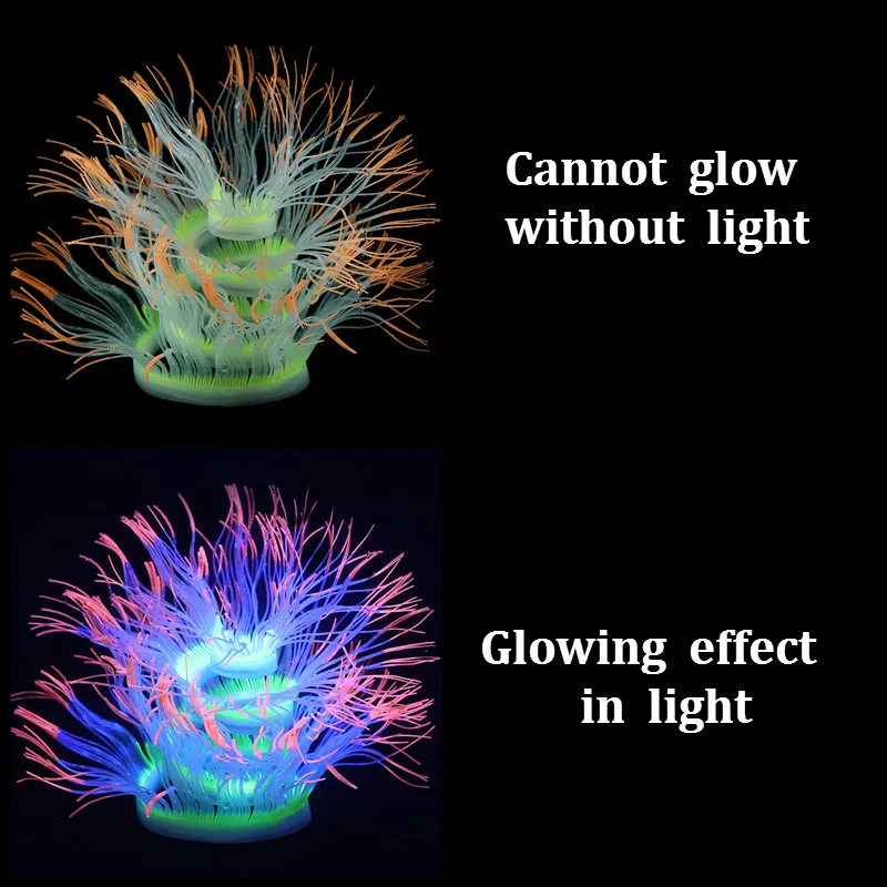 3, этот продукт не будет светиться сам по себе, вам нужно сочетать с аквариумным светильник. Светящийся эффект будет лучше, если он будет светильник с синими или фиолетовыми лампами.