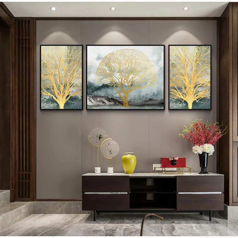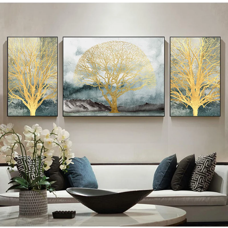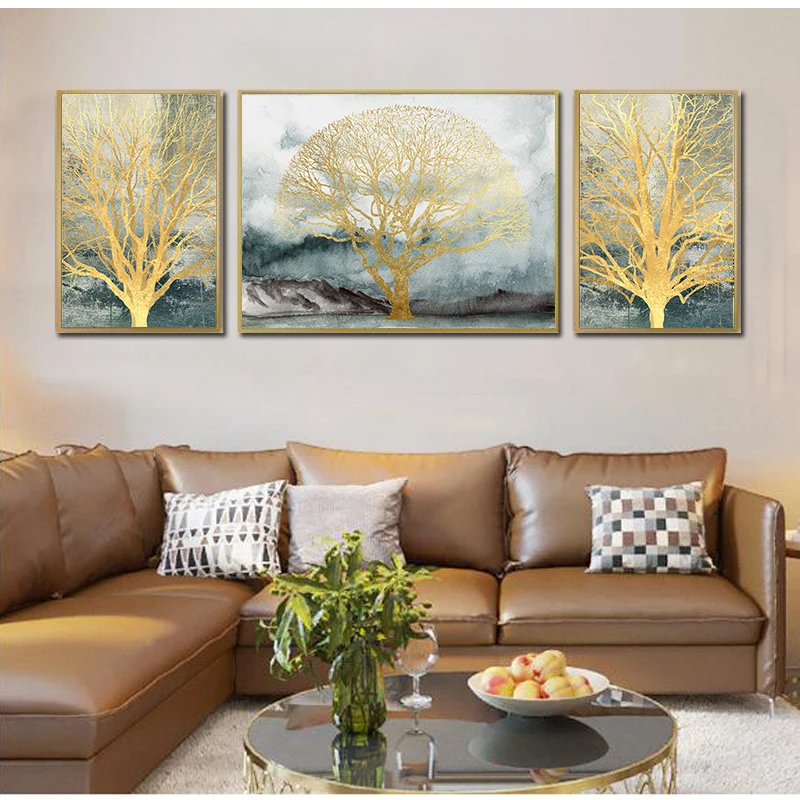 Абстрактный лес Золотой Счастливое дерево холст искусство растения плакат HD картина на стену для гостиной мода Куадрос Декор 3 панели