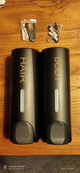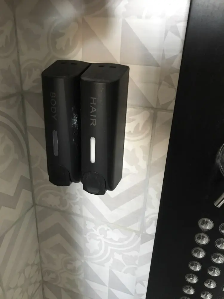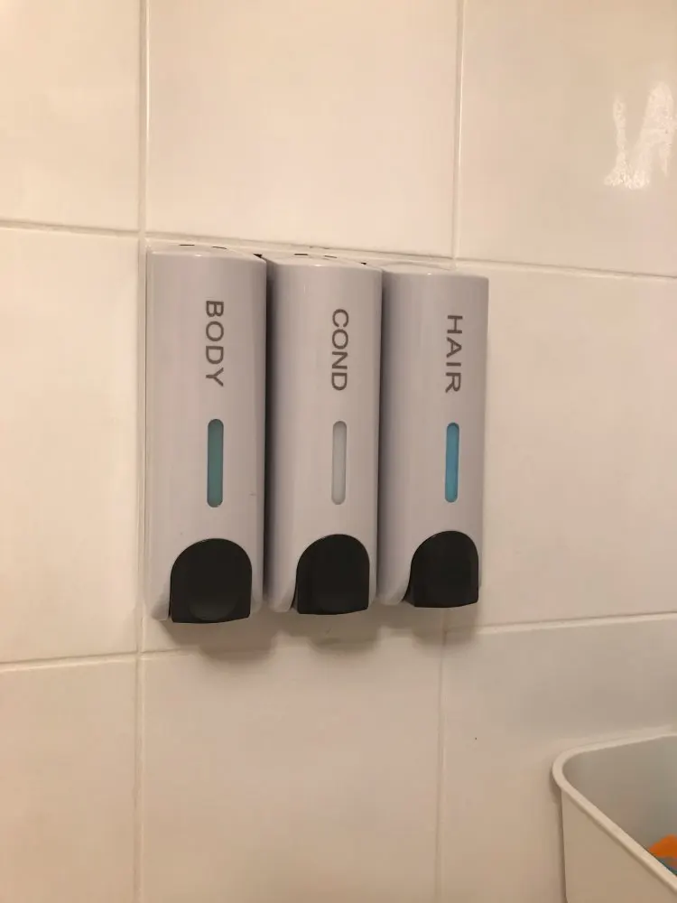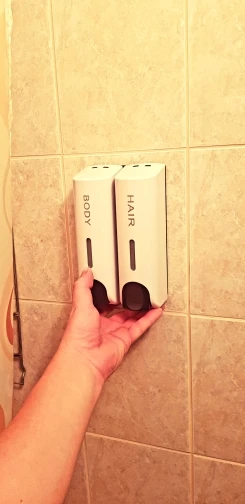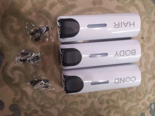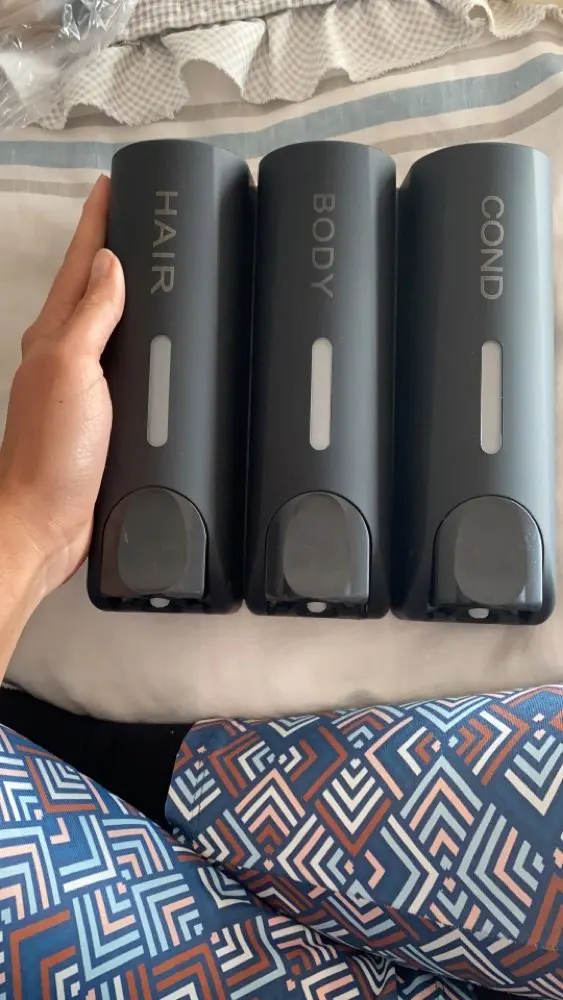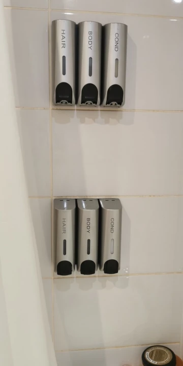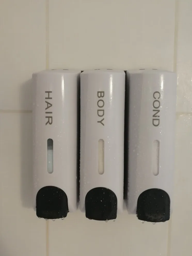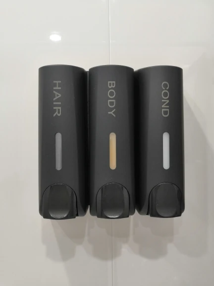 Дозаторы очень красивые. После принятия душа капли воды высыхают и не оставляют следов, разводов, чего я так боялась. Выдаёт жидкость столько, сколько выдают Дозаторы в торговых комплексах в туалетах. Шампунь и кондиционер выдаёт достаточно, а гель для душа наливаю отдельно. Объем 350 мл. Хватает налогов. Вода внутрь не попадает)