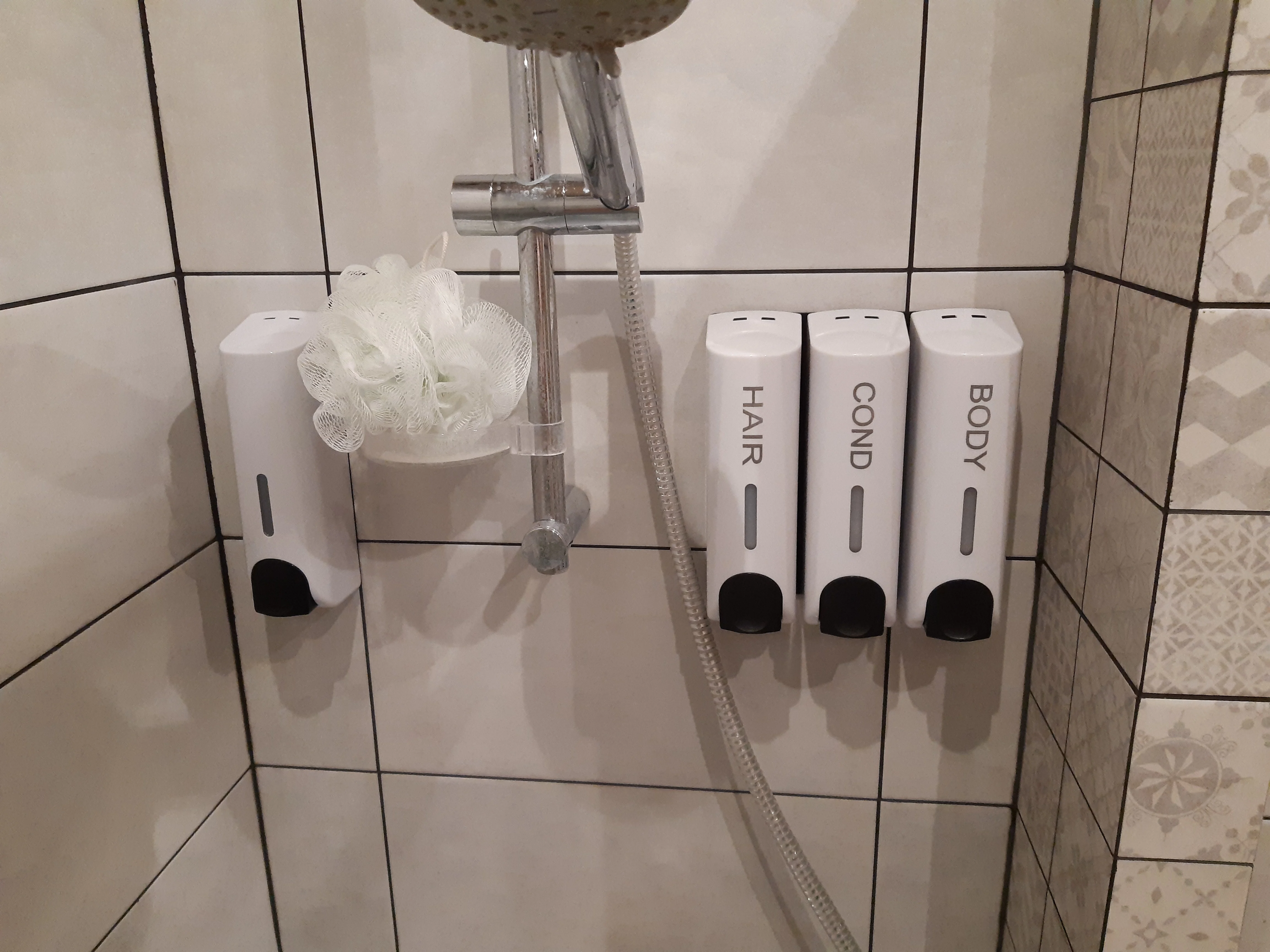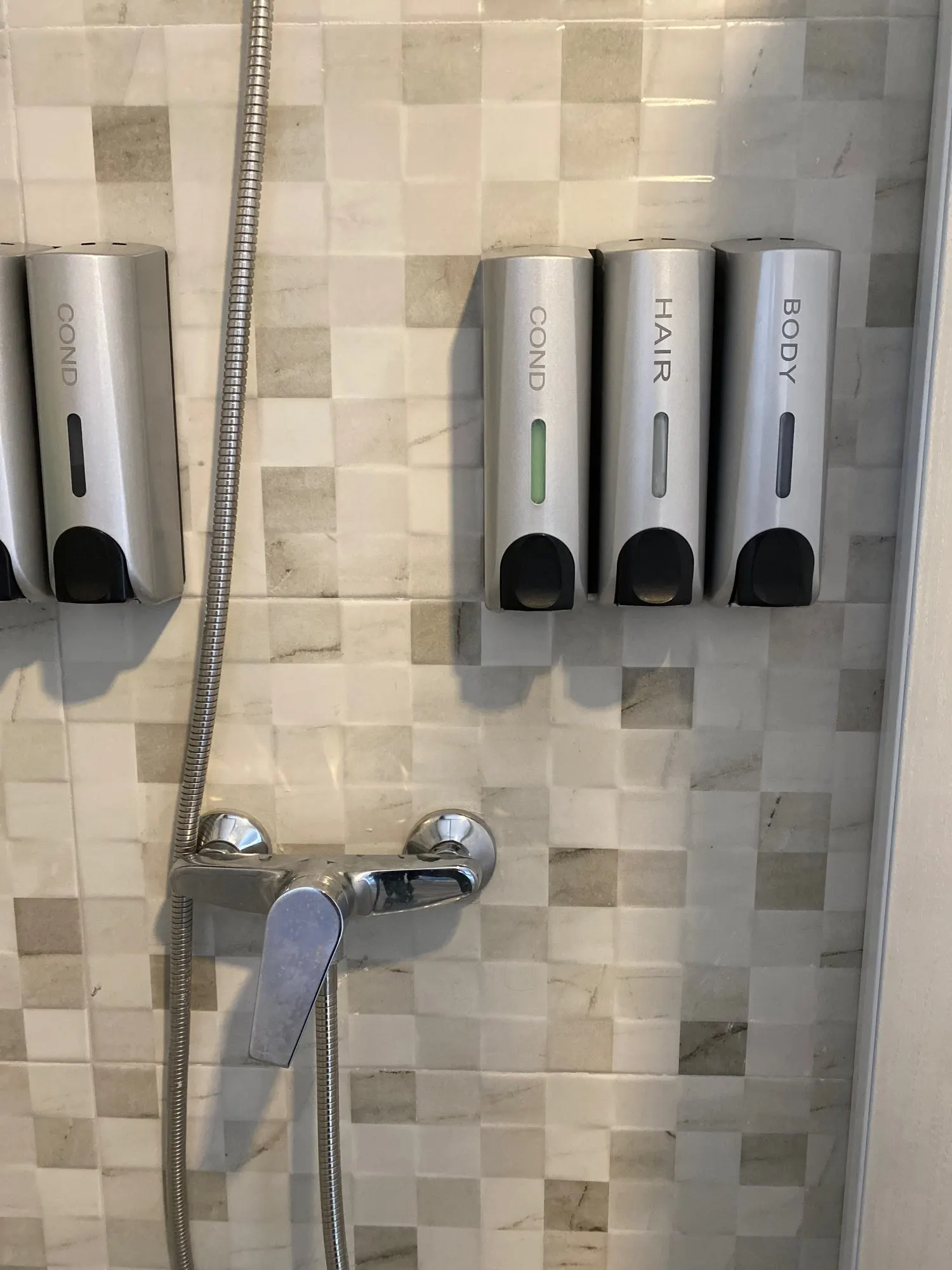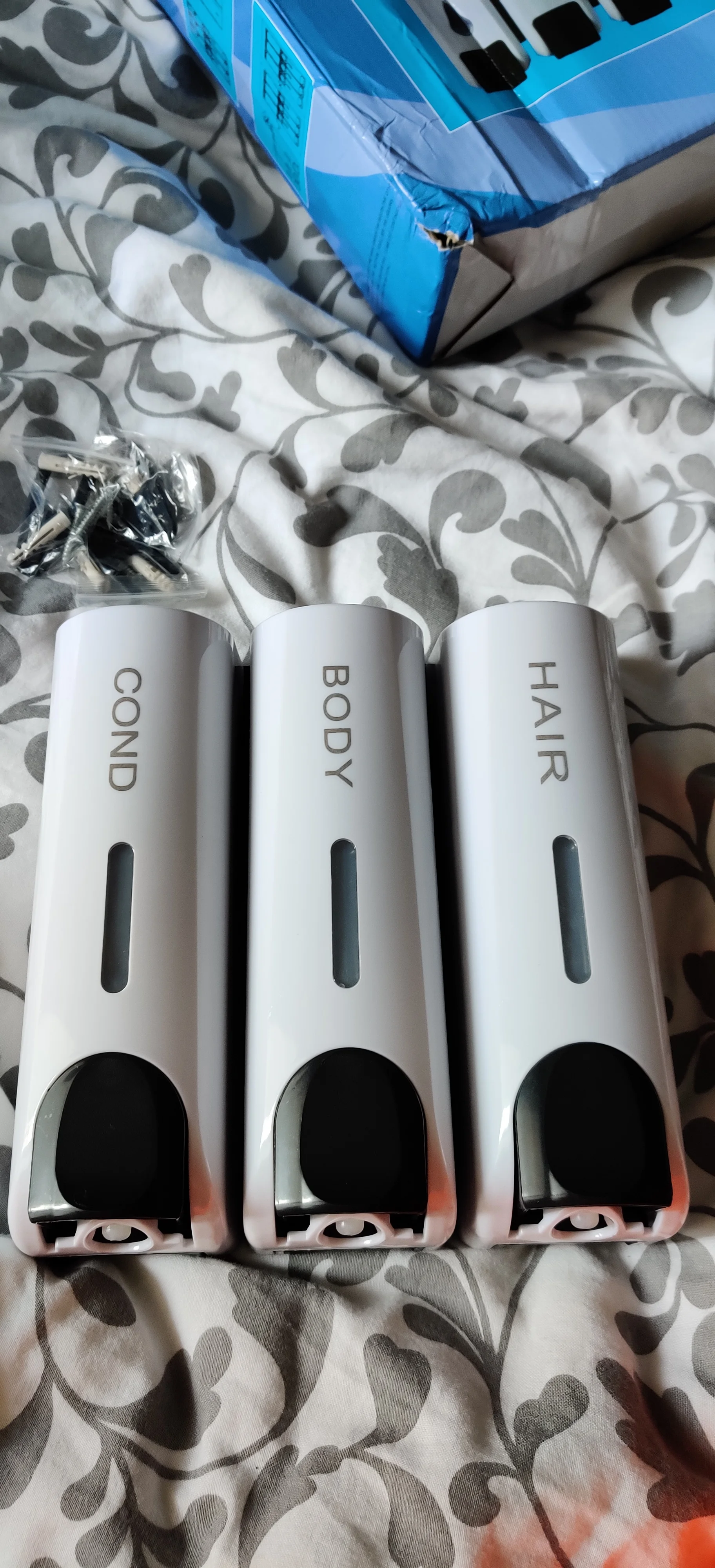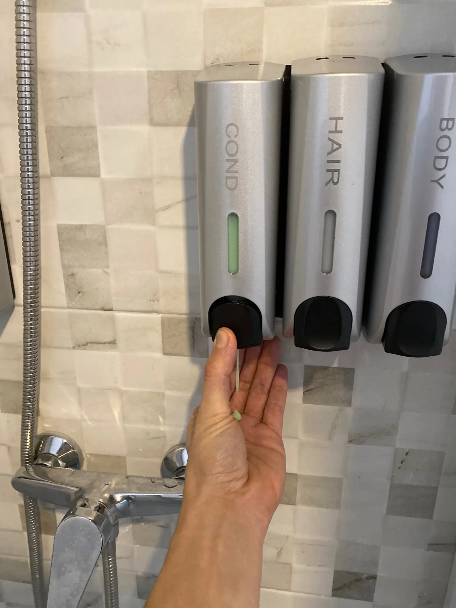 Дозаторы очень красивые. После принятия душа капли воды высыхают и не оставляют следов, разводов, чего я так боялась. Выдаёт жидкость столько, сколько выдают Дозаторы в торговых комплексах в туалетах. Шампунь и кондиционер выдаёт достаточно, а гель для душа наливаю отдельно. Объем 350 мл. Хватает налогов. Вода внутрь не попадает)
