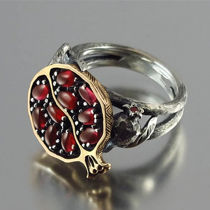 Винтажное кольцо с красным гранатом в стиле бохо с фруктовым деревом и гранатом