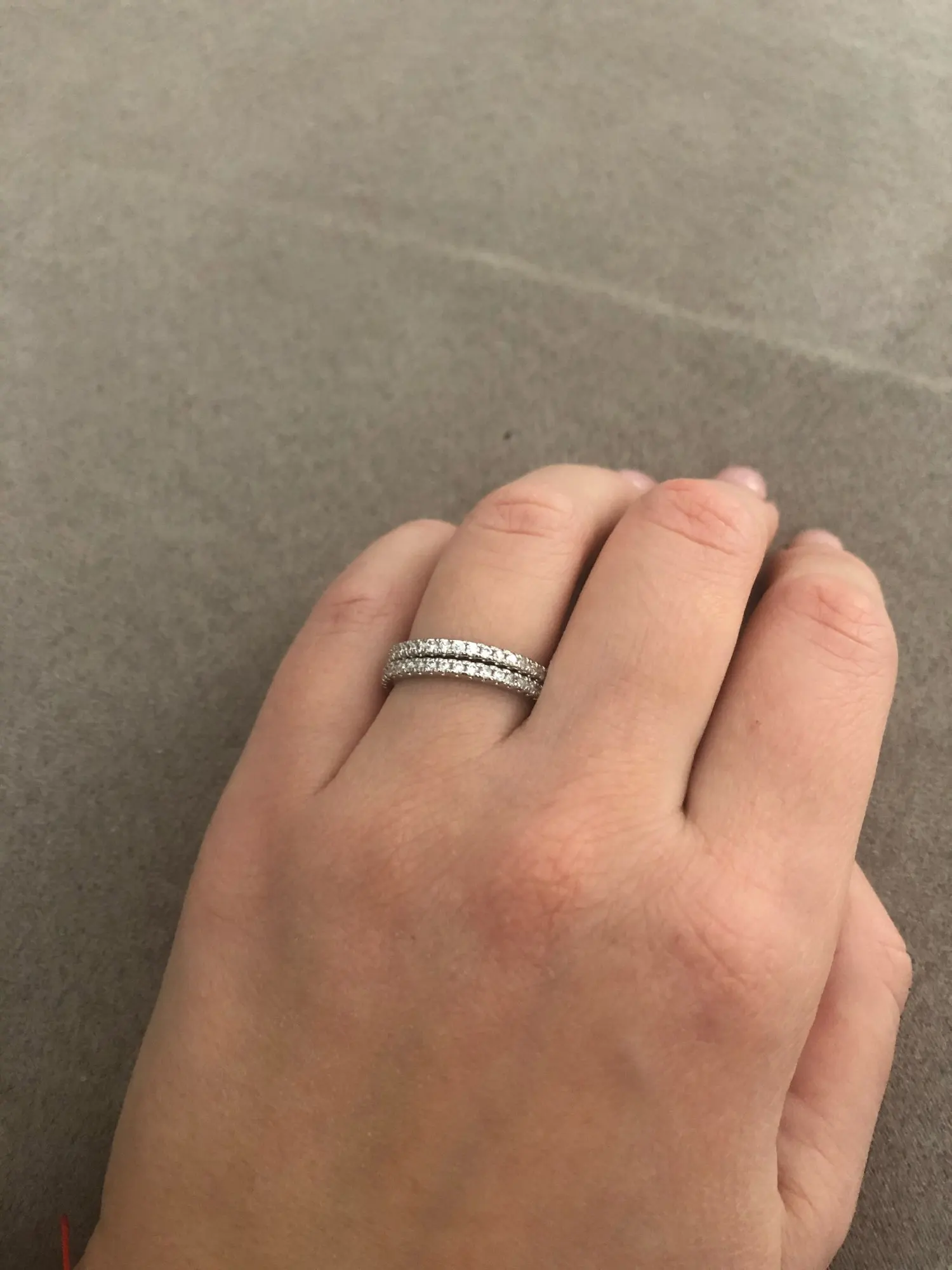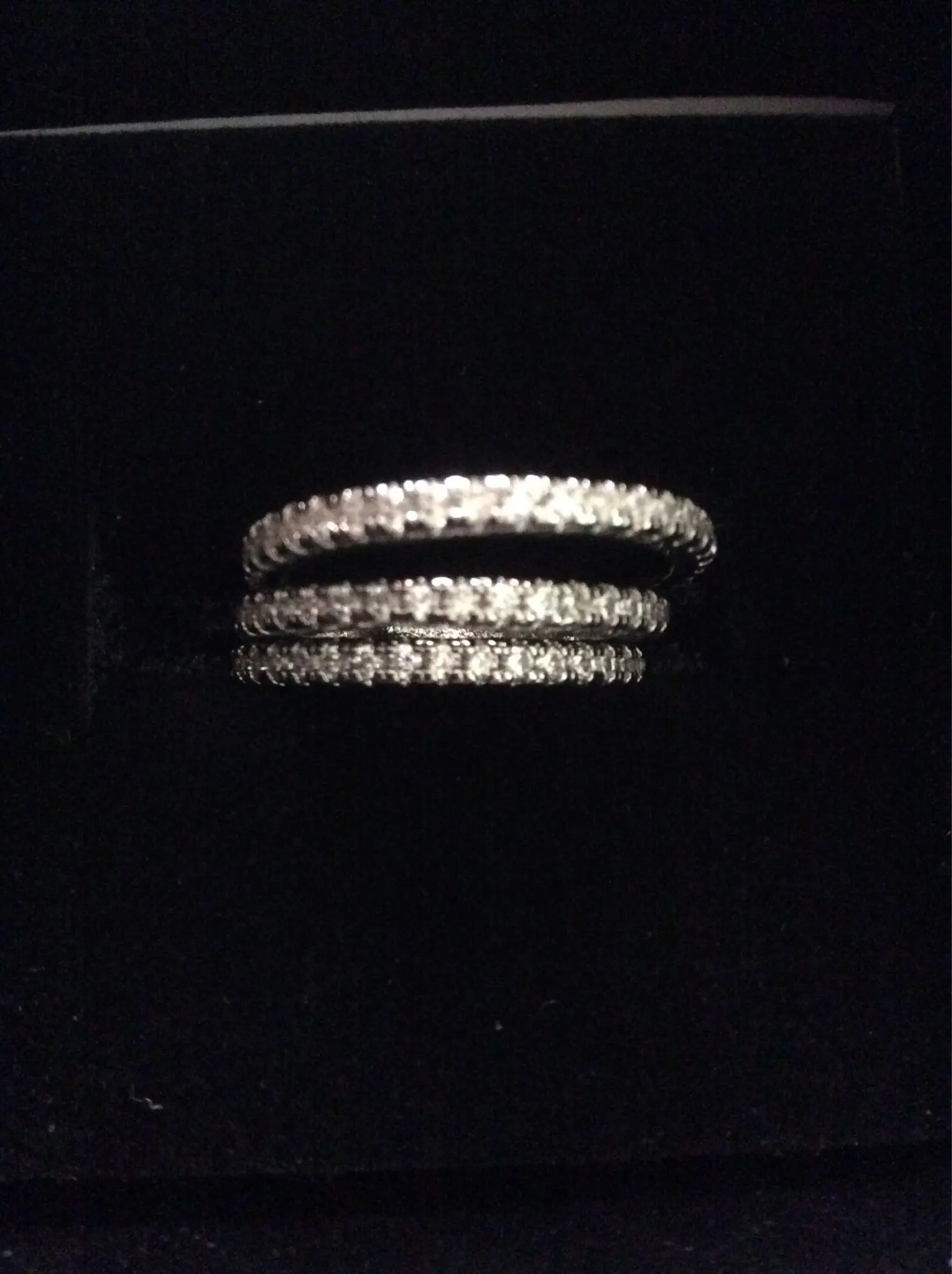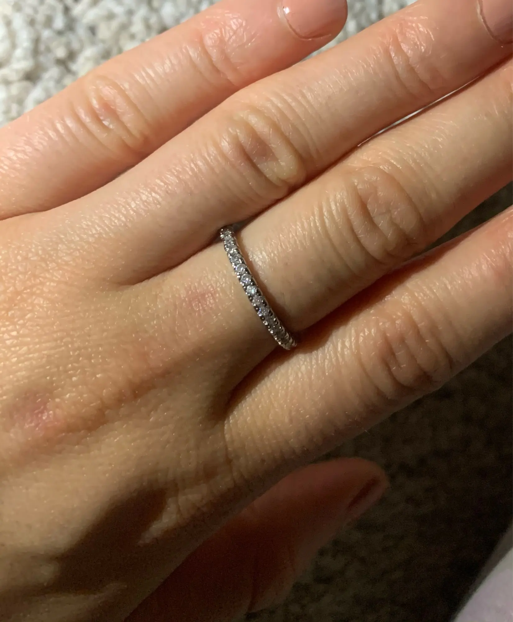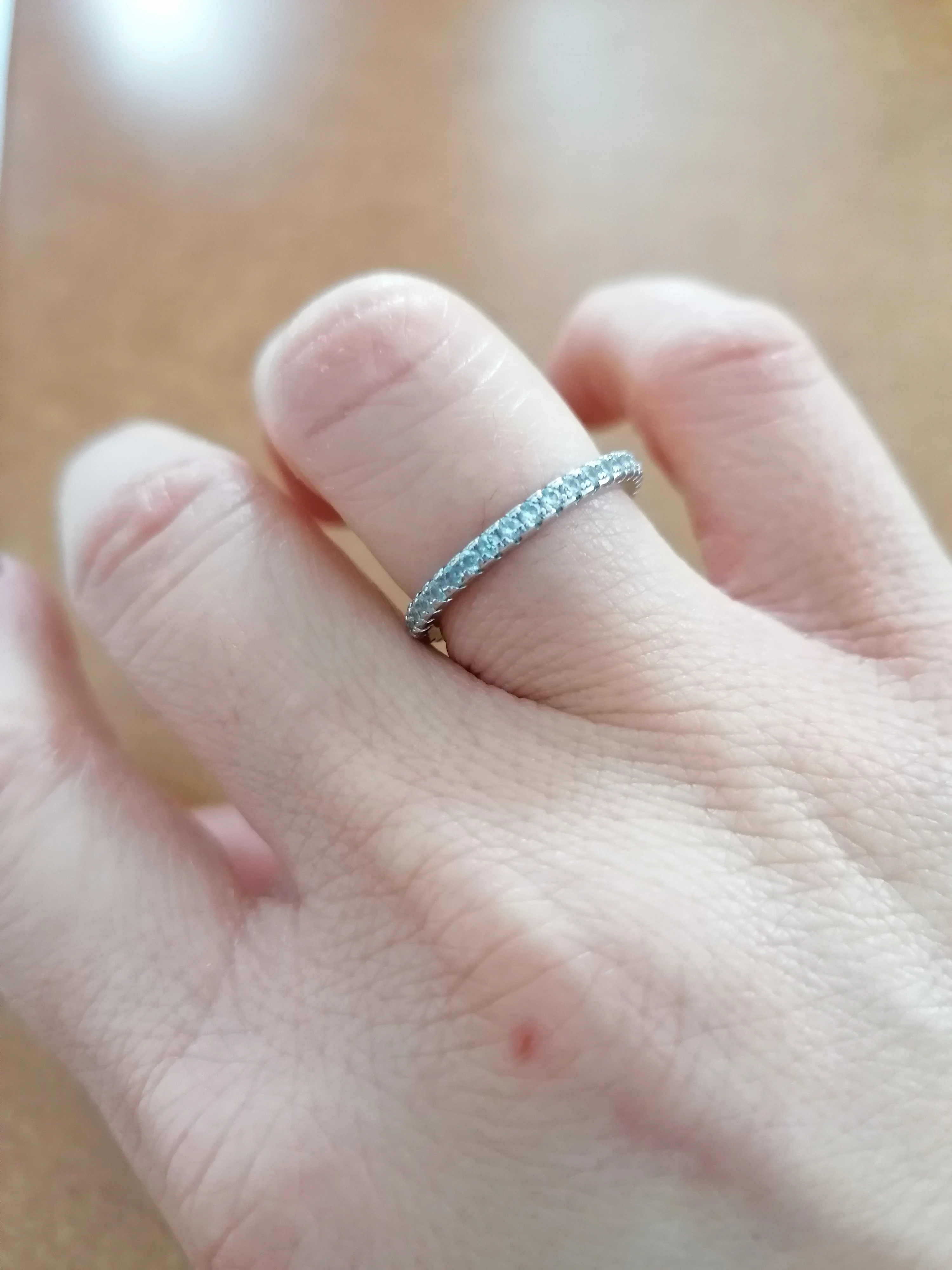 Я ношу это кольцо непрерывно уже более недели, и оно по-прежнему выглядит отлично! Нет странного обесцвечивания, нет пропущенных камней. Единственное, что я замечал, это cz не так сверкающий, как когда он был совершенно новым. Но он все еще выглядит настоящим. Изображение с моим настоящим алмазом и платиновой лентой для свадьбы (сверху).