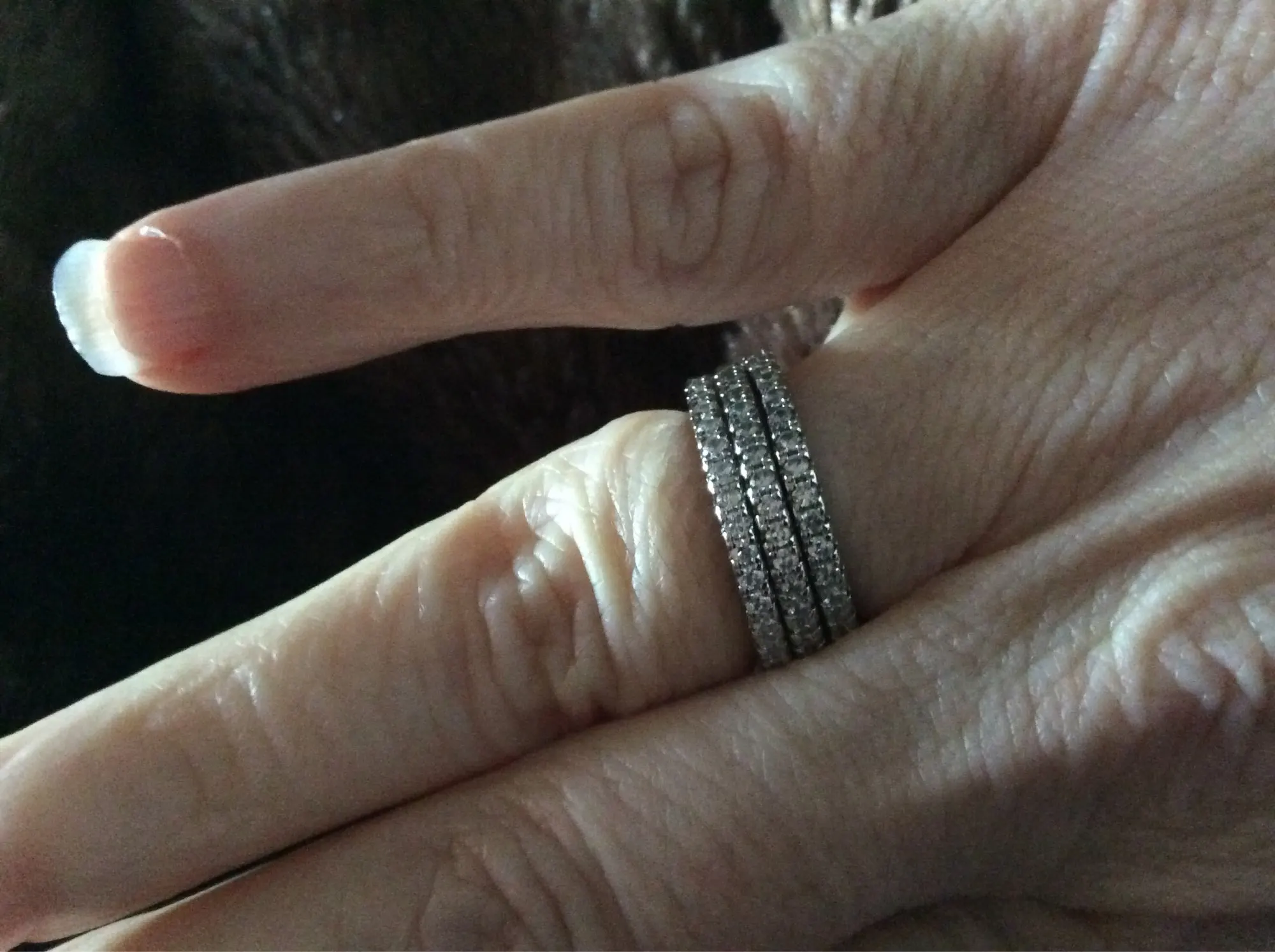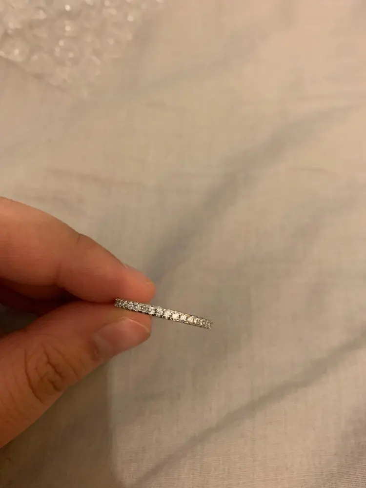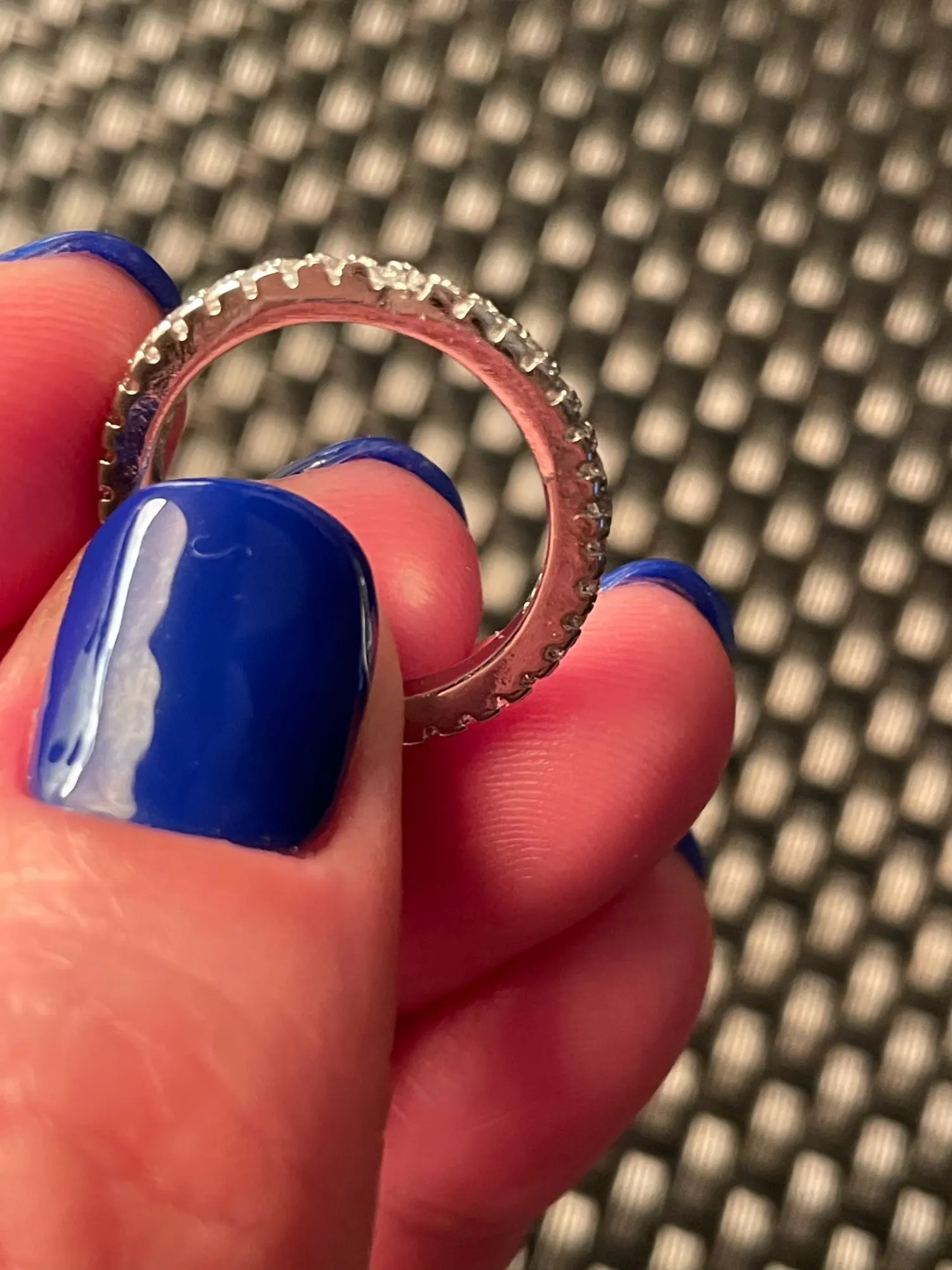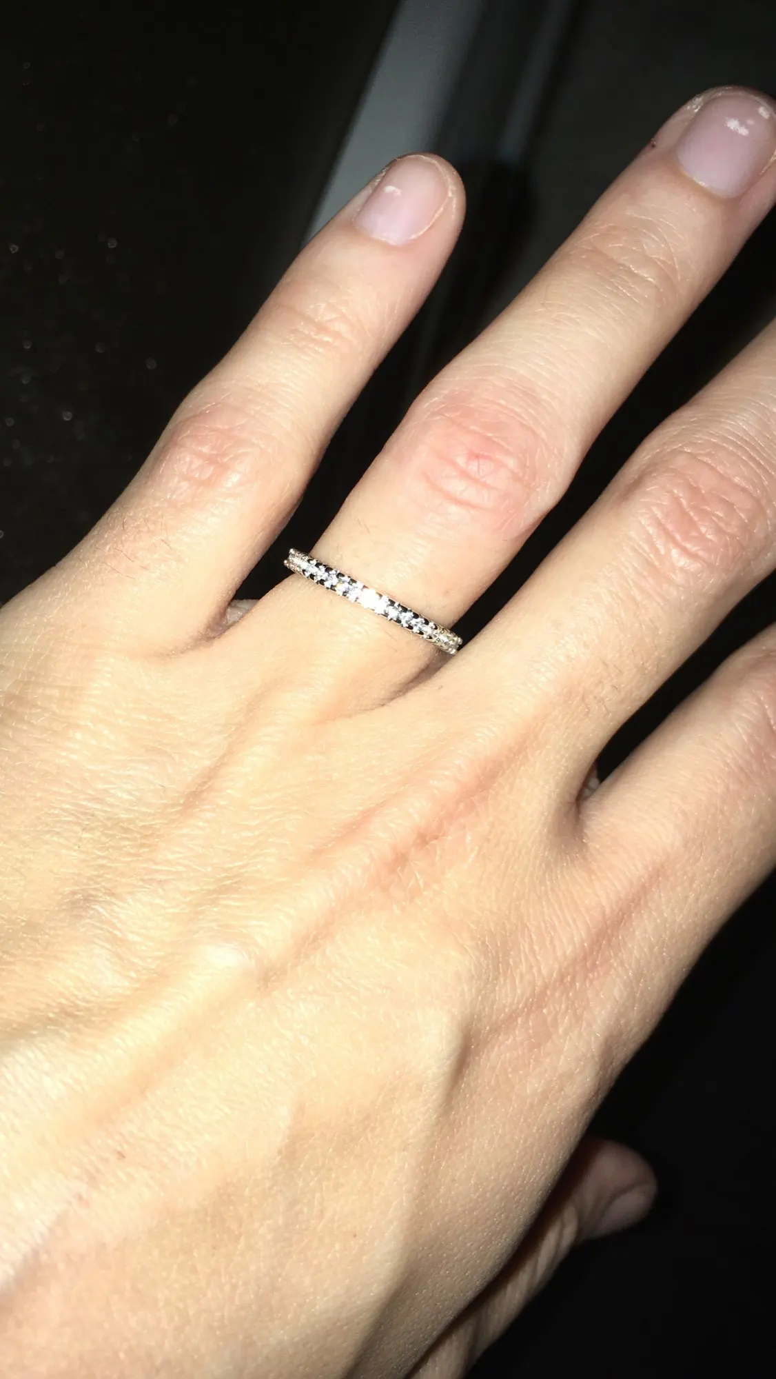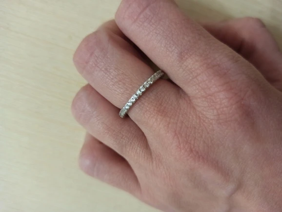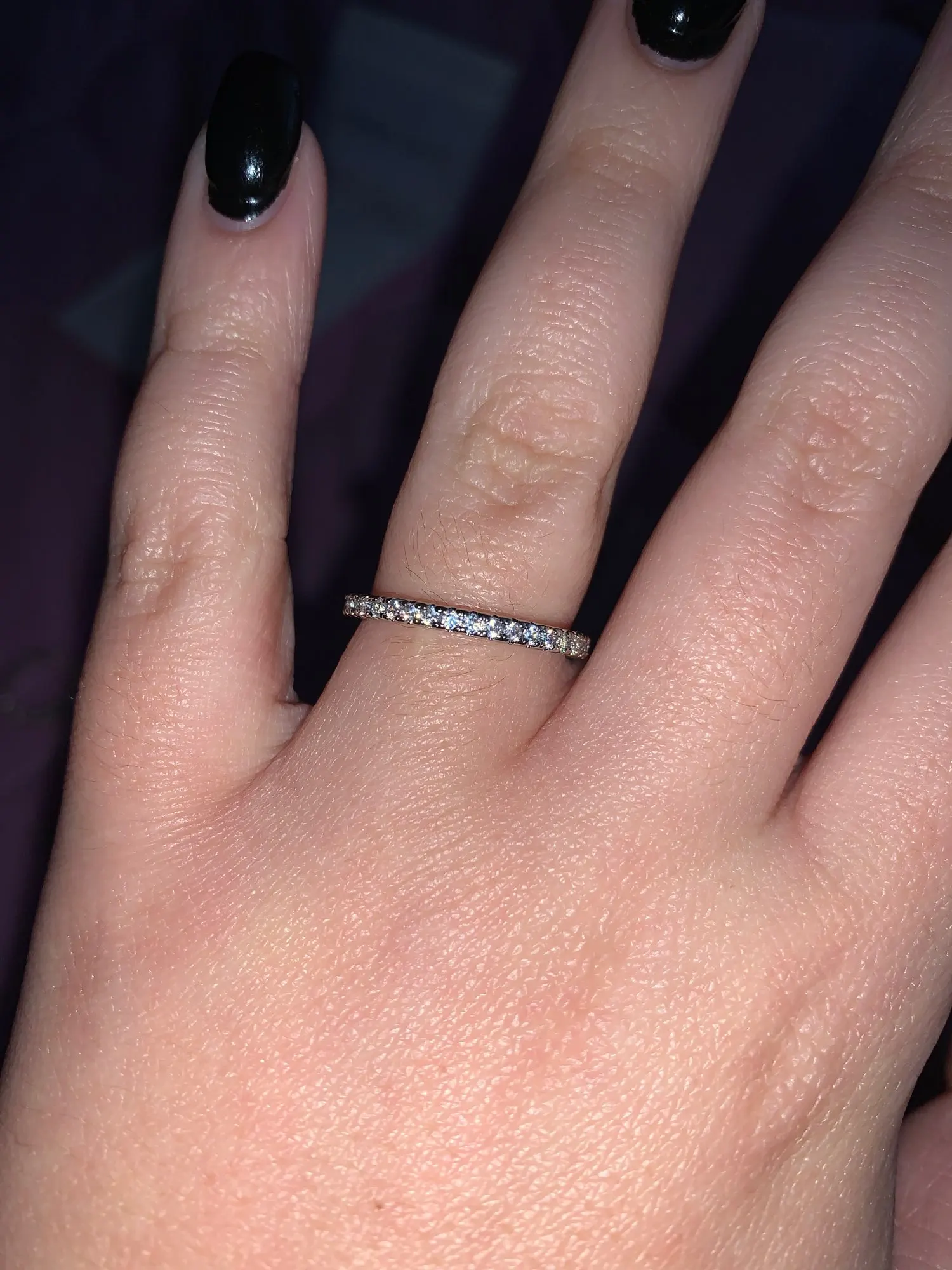 Я ношу это кольцо непрерывно уже более недели, и оно по-прежнему выглядит отлично! Нет странного обесцвечивания, нет пропущенных камней. Единственное, что я замечал, это cz не так сверкающий, как когда он был совершенно новым. Но он все еще выглядит настоящим. Изображение с моим настоящим алмазом и платиновой лентой для свадьбы (сверху).