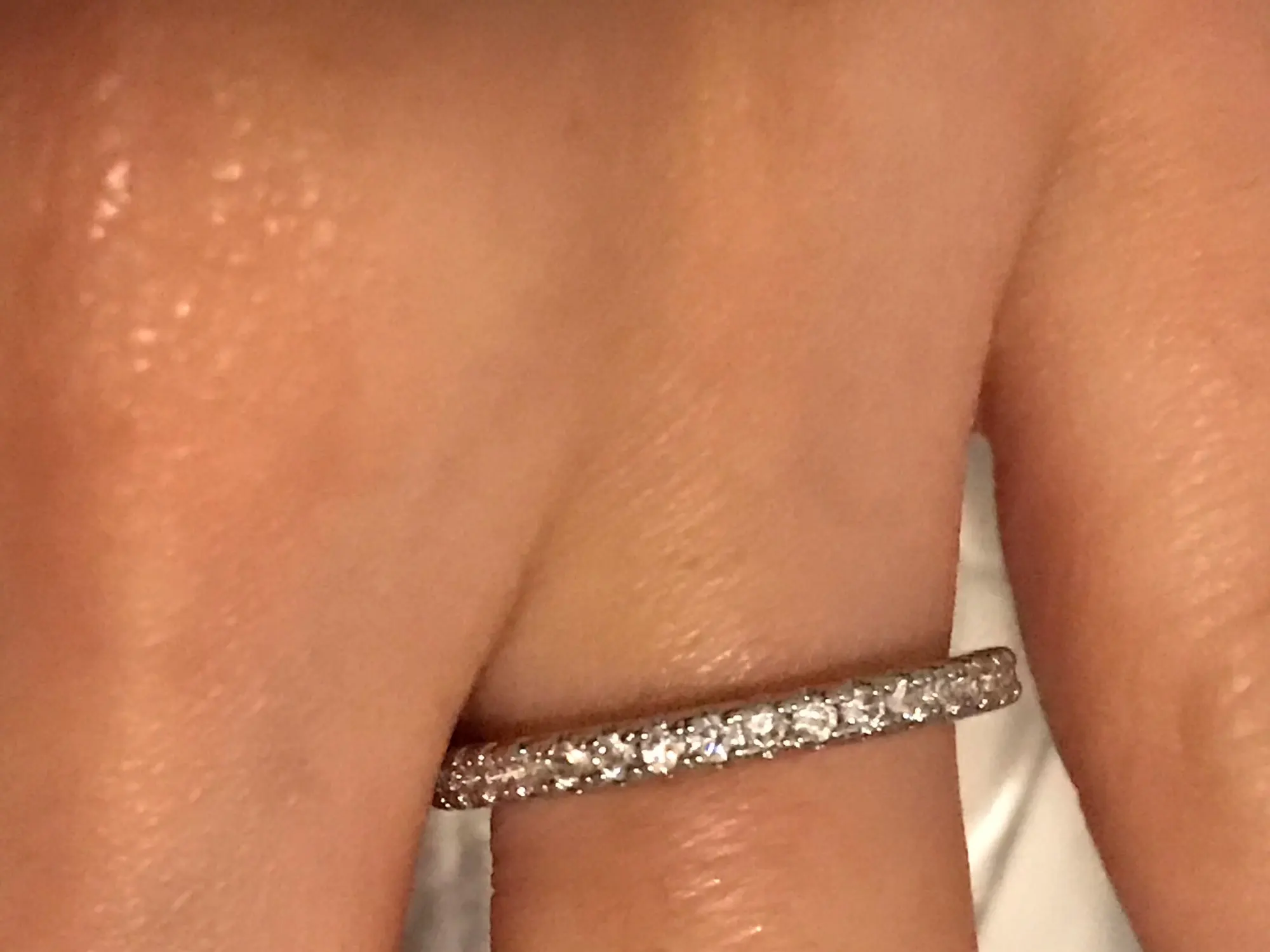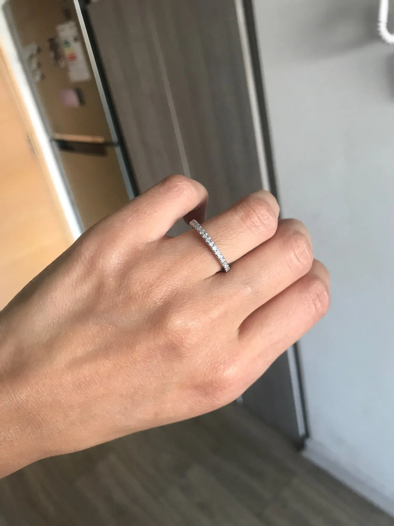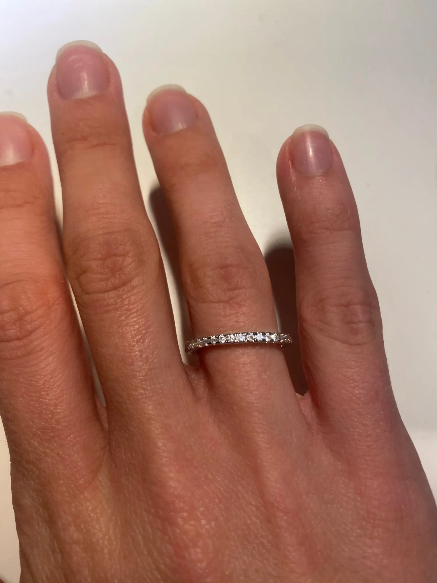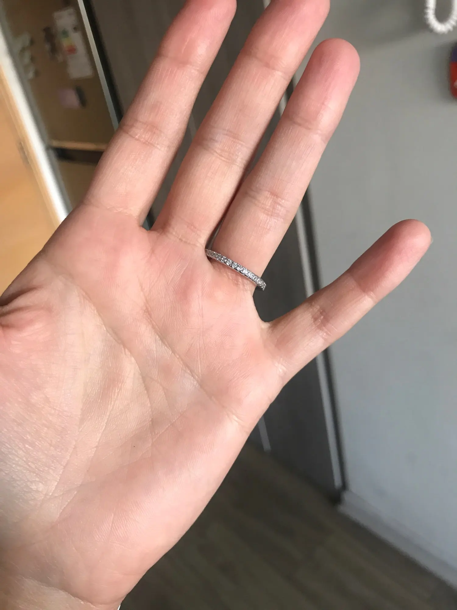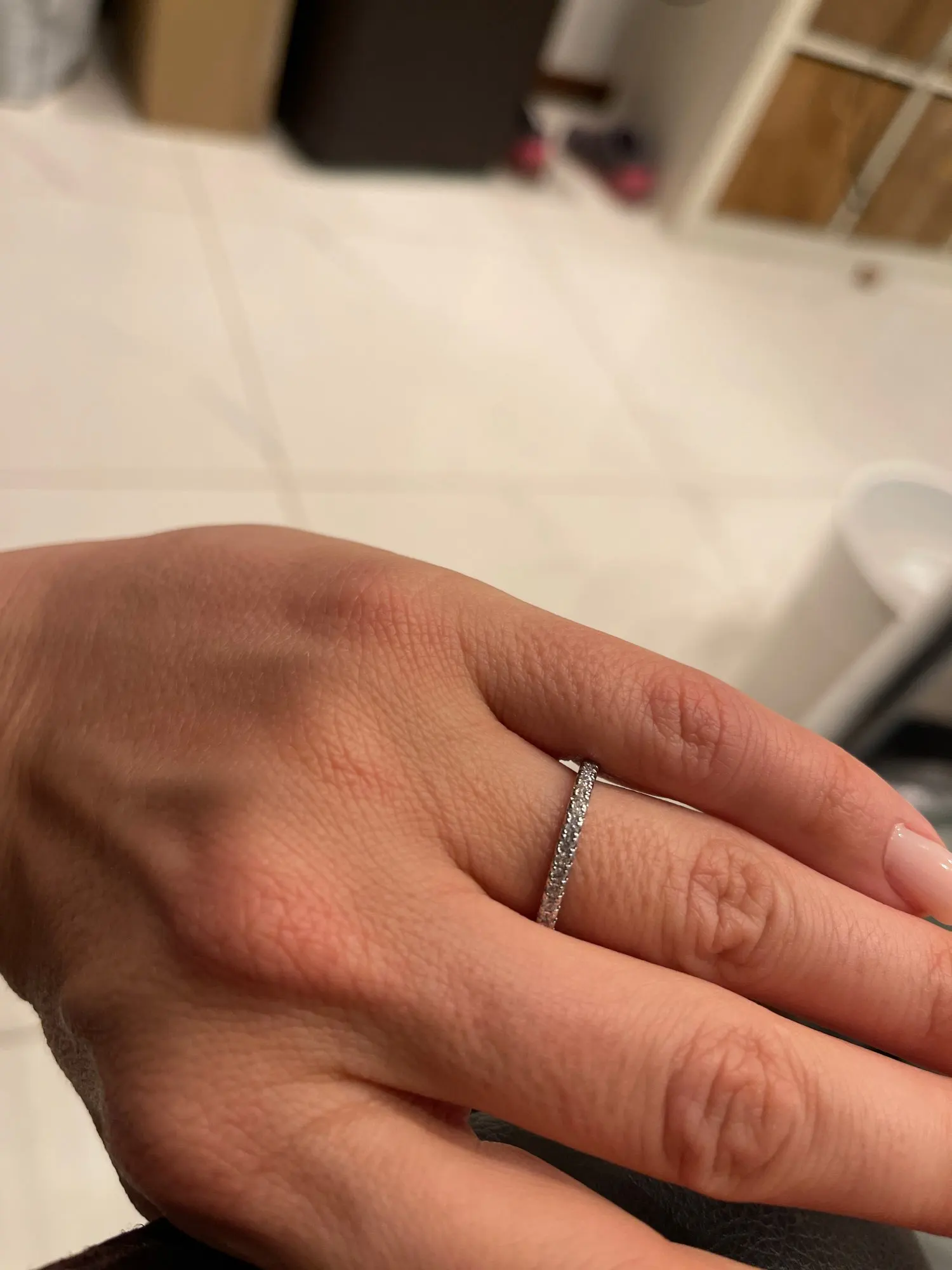 Я ношу это кольцо непрерывно уже более недели, и оно по-прежнему выглядит отлично! Нет странного обесцвечивания, нет пропущенных камней. Единственное, что я замечал, это cz не так сверкающий, как когда он был совершенно новым. Но он все еще выглядит настоящим. Изображение с моим настоящим алмазом и платиновой лентой для свадьбы (сверху).