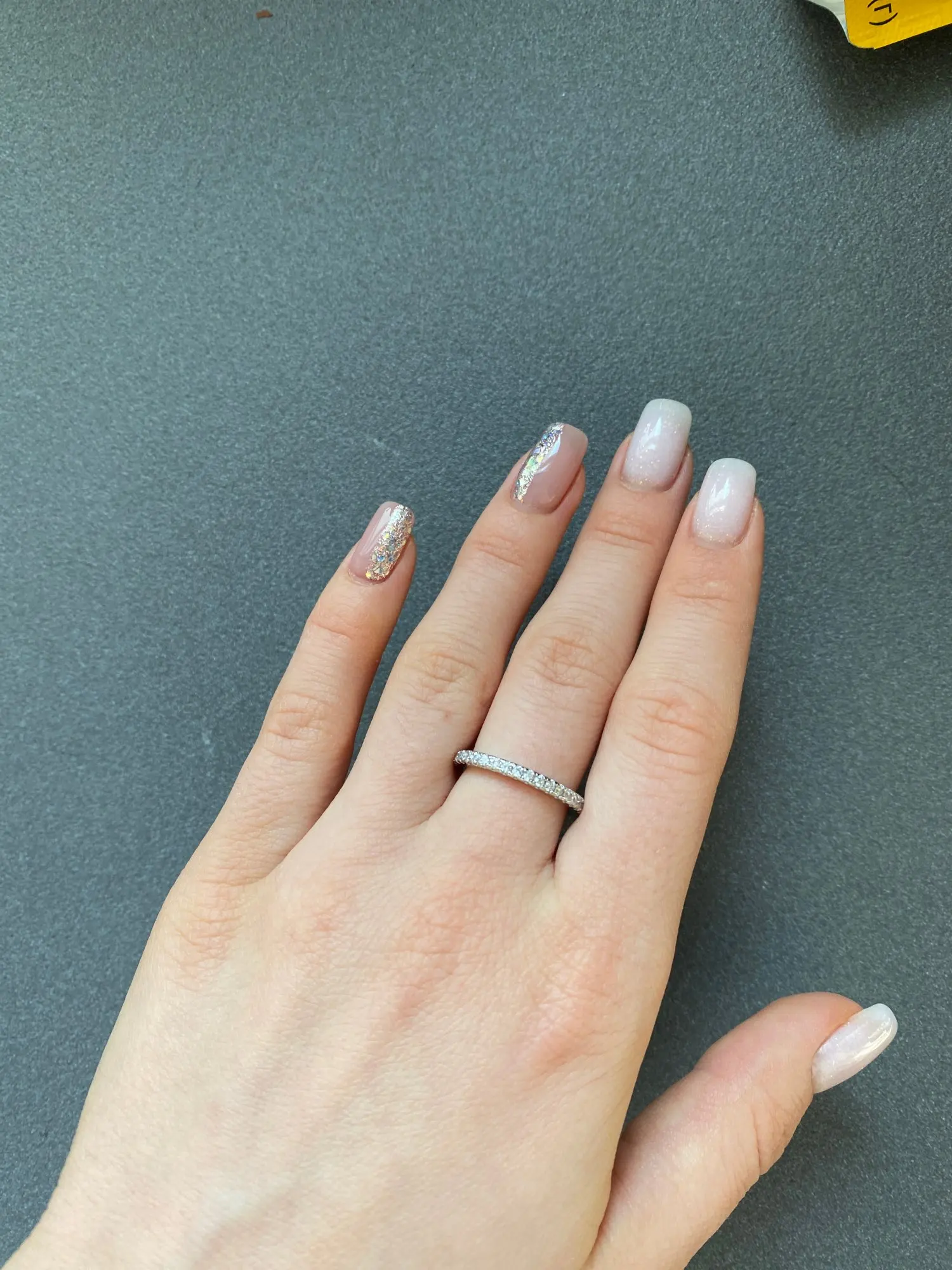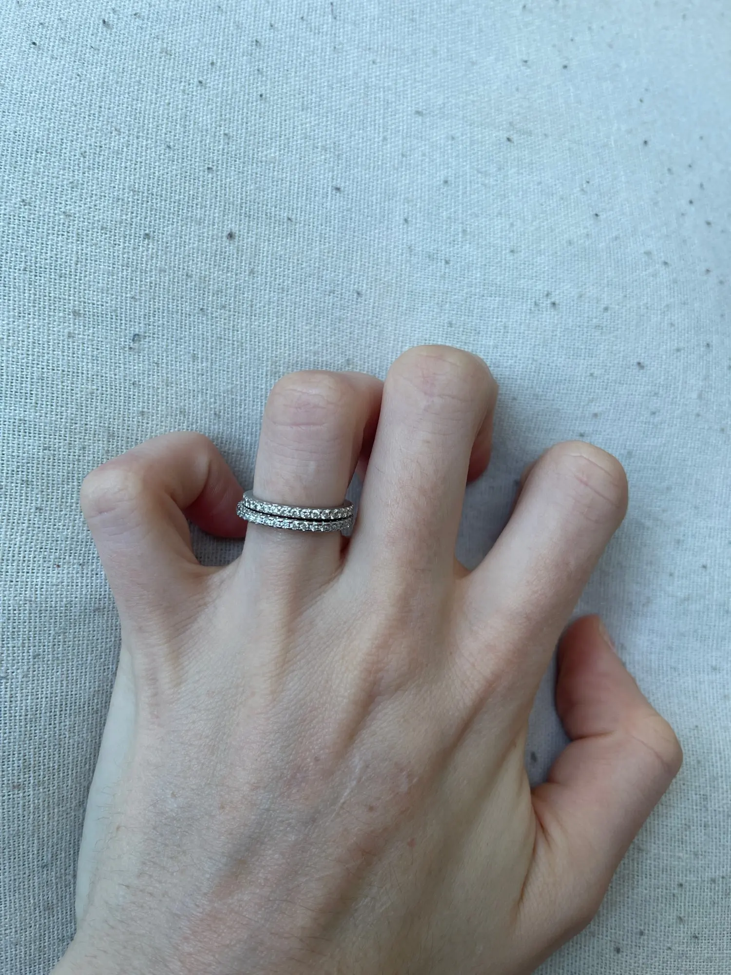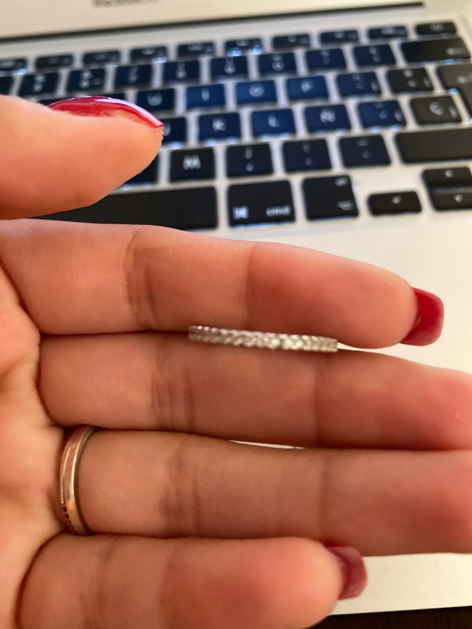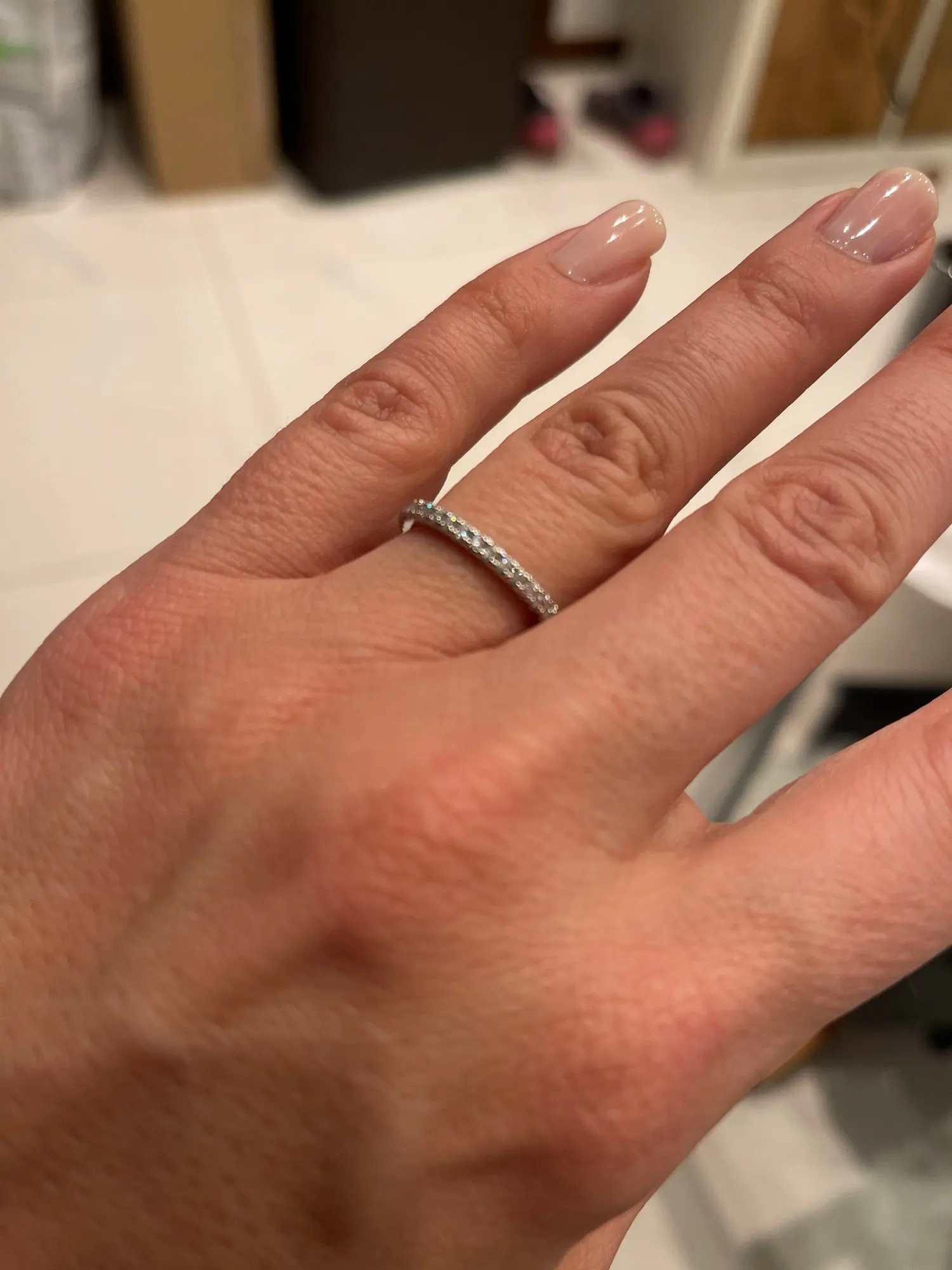 Я ношу это кольцо непрерывно уже более недели, и оно по-прежнему выглядит отлично! Нет странного обесцвечивания, нет пропущенных камней. Единственное, что я замечал, это cz не так сверкающий, как когда он был совершенно новым. Но он все еще выглядит настоящим. Изображение с моим настоящим алмазом и платиновой лентой для свадьбы (сверху).