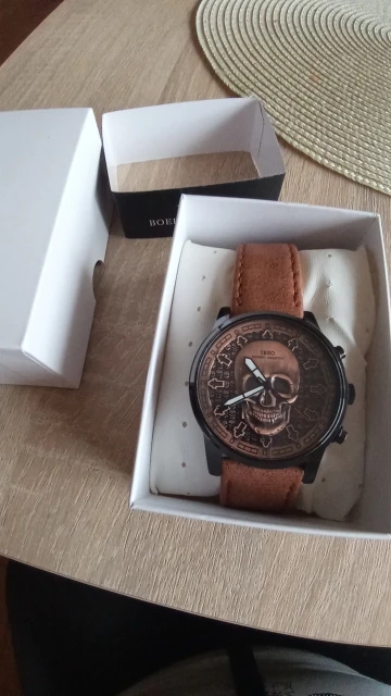 La montre est très sympa pour le prix demandé. L'envoi est soigné dans une boite de qualité, et de plus le délai d'expédition était très au-dessus de la moyenne pour Aliexpress. Un seul bémol, le bracelet de la montre ne me parait pas être du cuir, mais une bande de caoutchouc sur la face intérieure de laquelle une très mince bande de cuir a été collée. Quant à l'extérieur du bracelet, il est terne et mat, sans grain et sans odeur de cuir... Bref, du caoutchouc !