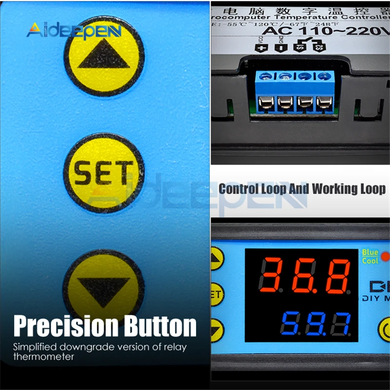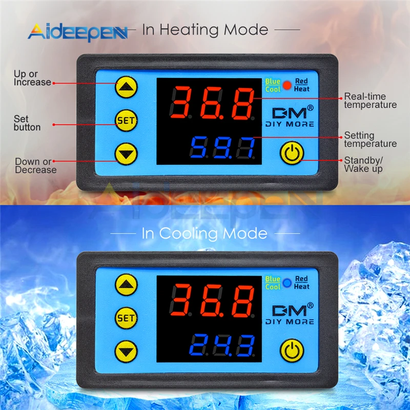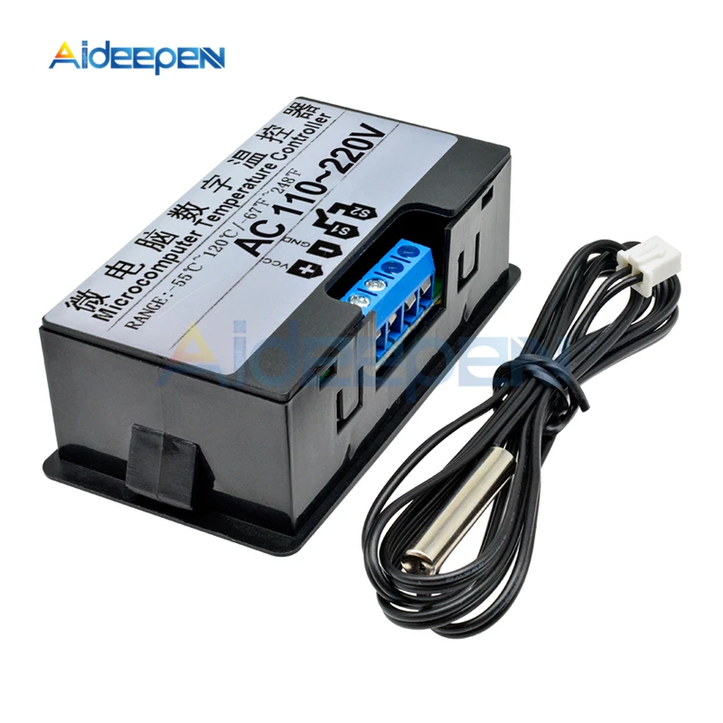 Характеристики:Диапазон контроля температуры: -55 °C ~ 120 °C/-67 °F ~ 248 °FТочность контроля температуры: 0,1 °C/0,1 °FЦвет дисплея: красный + синийРабочий Источник питания: DC 12V DC 24V AC110V ~ 220VДатчик: NTC 10K 1 метр (с зондом)Размер изделия: 79,2 мм × 41,9 мм × 26,3 ммРазмер отверстия: 72,1 мм × 39,2 ммВес изделия: 52 г (12 В/24 В) ,59 г (110 В ~ 220 В) Руководство по эксплуатации:1. Короткое нажатие «SET» маленькая цифровая трубка для вспышки, нажмите «△» или «▽» для установки целевой температуры, нажмите кнопку «режим ожидания» или не используйте, чтобы сохранить настройки в течение 3 секунд.2. Нажмите и удерживайте кнопку «SET», чтобы войти в режим настройки кода, нажмите «△» или «SET», чтобы переключить код. После выбора нажмите «SET», чтобы ввести настройки кода. После настройки нажмите кнопку «режим ожидания» или не используйте, чтобы сохранить настройки в течение 3 секунд.3. Последняя настройка параметров сохраняется по умолчанию после завершения работы.4. Восстановите заводские настройки: Нажмите и удерживайте кнопку «SET» для включения.5. Когда модуль включен, он начнет работать напрямую. После включения, нажмите и удерживайте кнопку «в режиме ожидания», модуль войдет в режим «сна» или «Пробуждение»; В чехол отключения питания, модуль будет работать автоматически после восстановления питания, не нужно начинать вручную. Примечание:Рабочее напряжение источника питания должно быть подключено в соответствии со стандартным напряжением этикетки, в противном случае модуль будет легко поврежден.