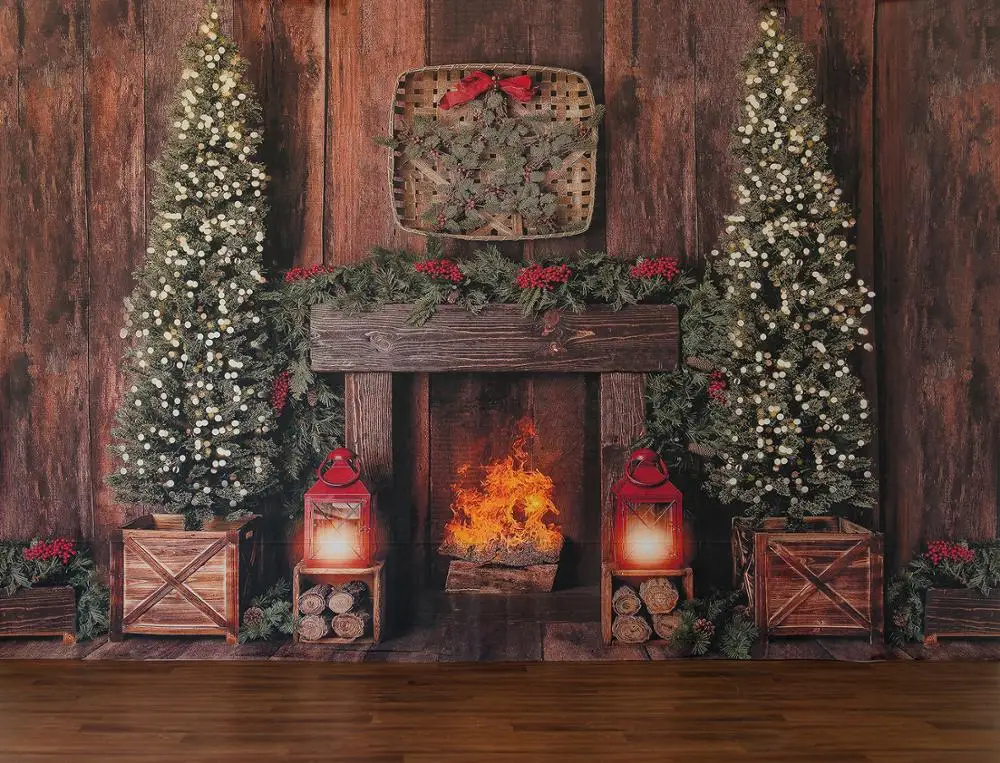 Фон для фотосъемки с изображением деревянной стены камина Рождественского украшения дерева в ретро стиле для фотостудии