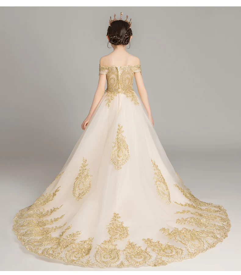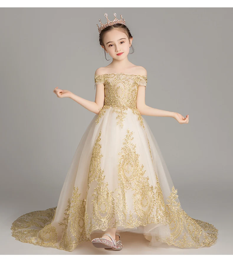 Свадебное платье для девочки, с открытыми плечами, с золотыми блестками, кружевное детское платье для первого причастия, детское платье для крещения, пышное платье, платья в цветочек для девочки