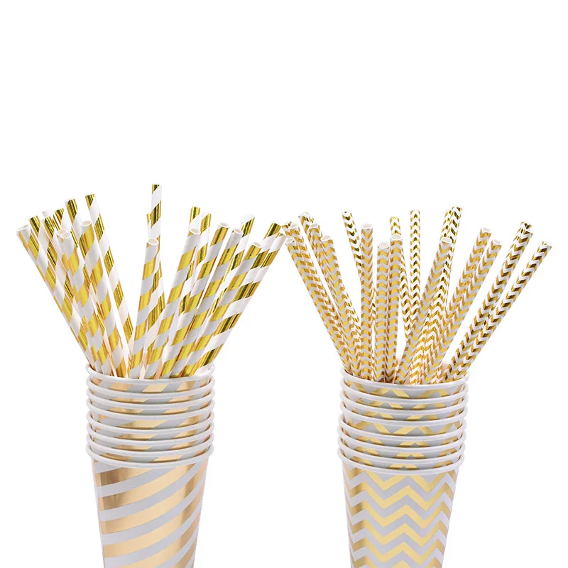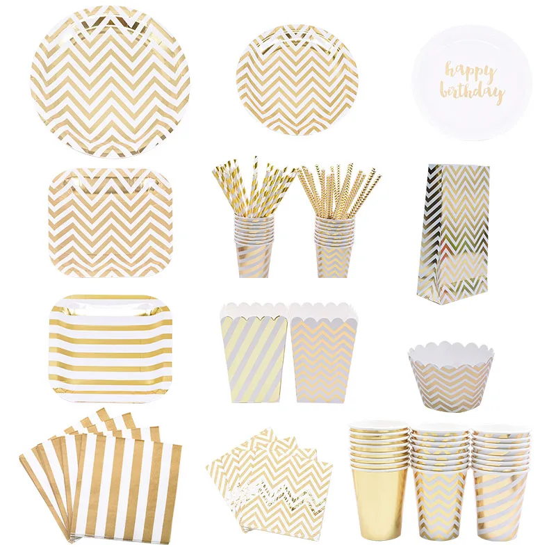 Одноразовая посуда в полоску под золото, 6-25 шт.лот, бумажные тарелки для рождевечерние, дня рождения, чашки, соломинки, салфетки, украшение для свадебвечерние НКИ