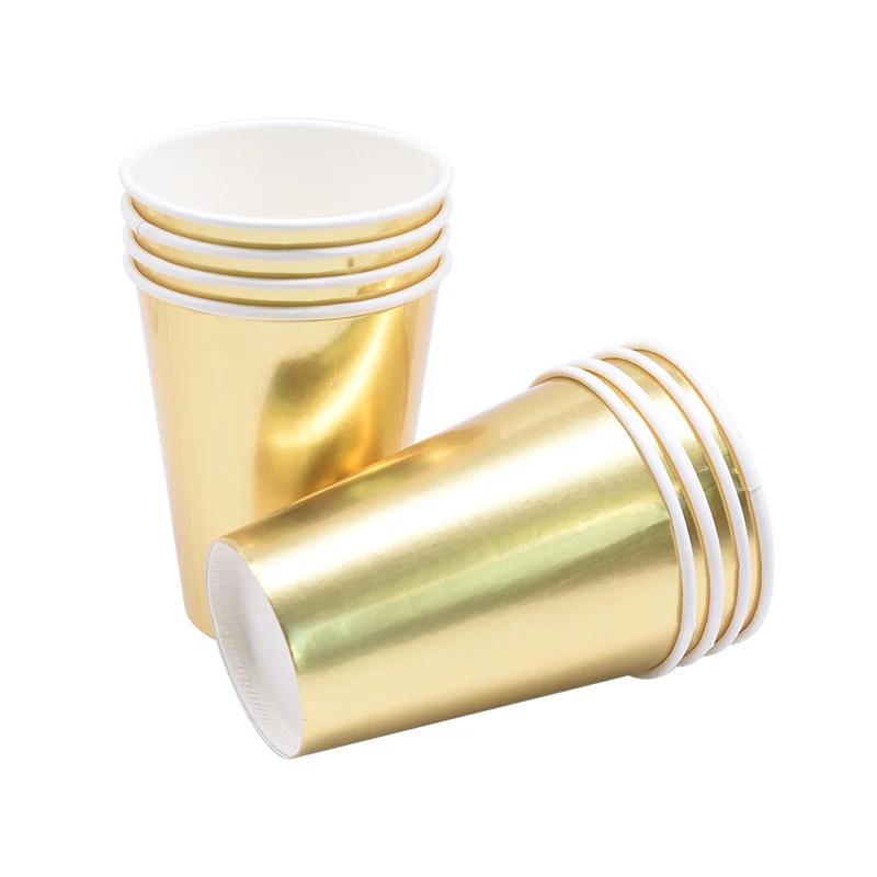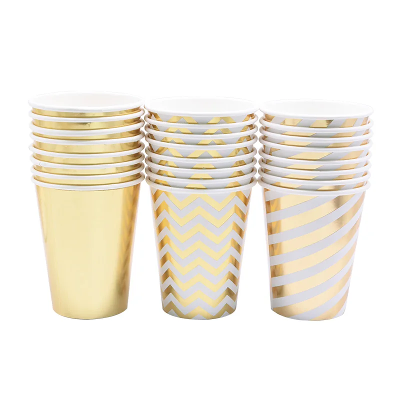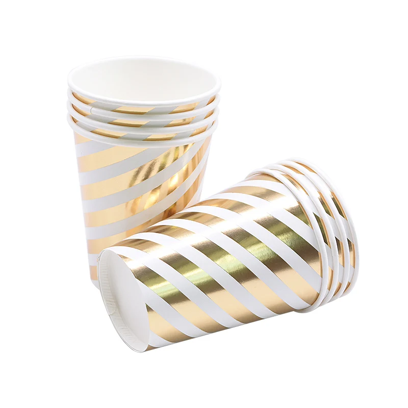 8 шт./лот, Золотая полосатая одноразовая посуда, рождественские бумажные тарелки для дня рождения, чашки, соломинки, салфетки для украшения свадебной вечеринки