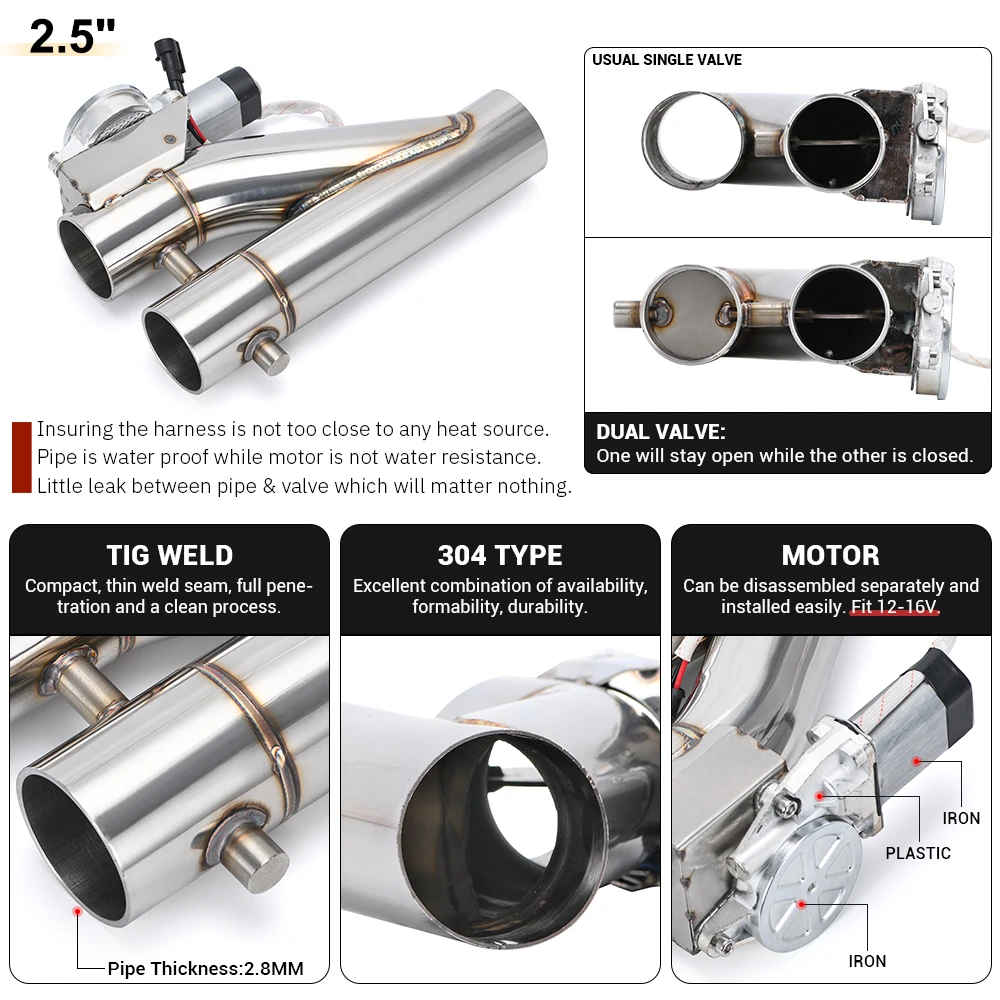 Применимость Выхлопная труба 2,25 "/2,5" / 3 "(без прямого болта на изделии) Пожалуйста, выберите правильный размер перед заказом. Посылка: 2 x Электрический выхлоп с двойным клапаном 1 x Беспроводной пульт дистанционного управления 1 х y-адаптер 2 x жгута проводов