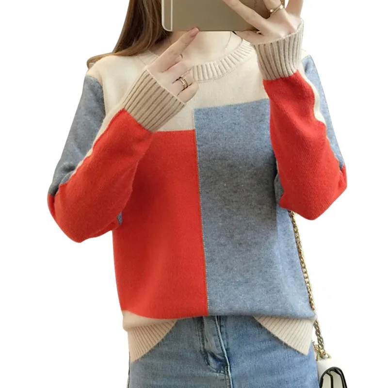Зимний свитер контрастных цветов, женский джемпер с длинным рукавом, женский свитер, пуловер, вязаный свитер, Женский пуловер
