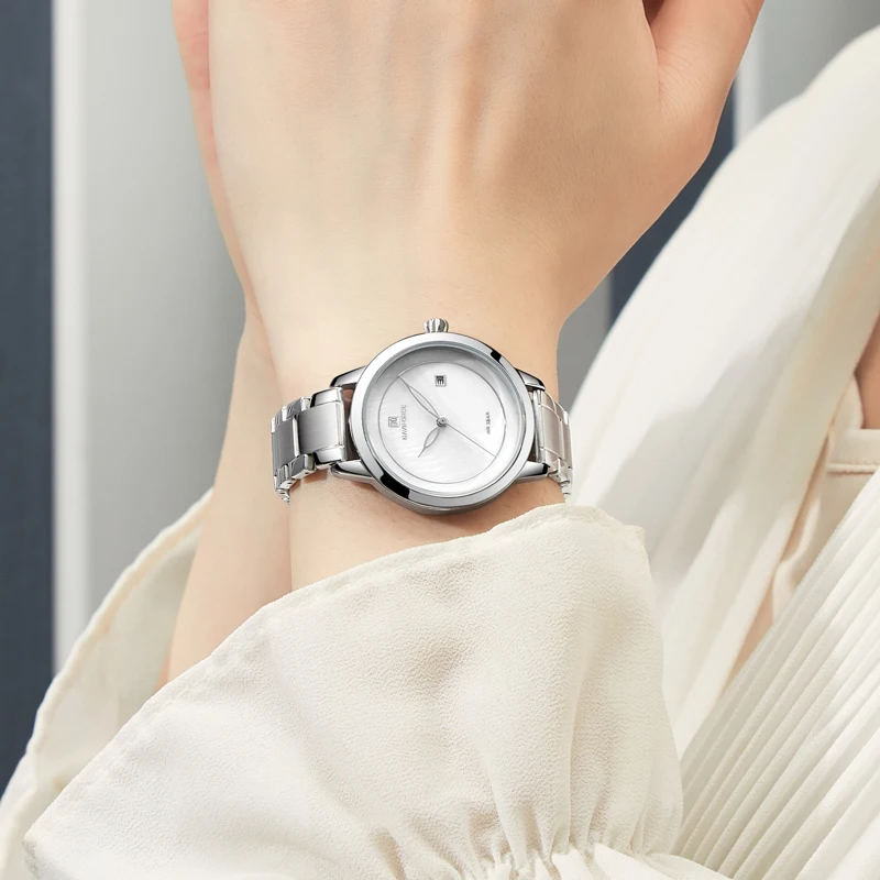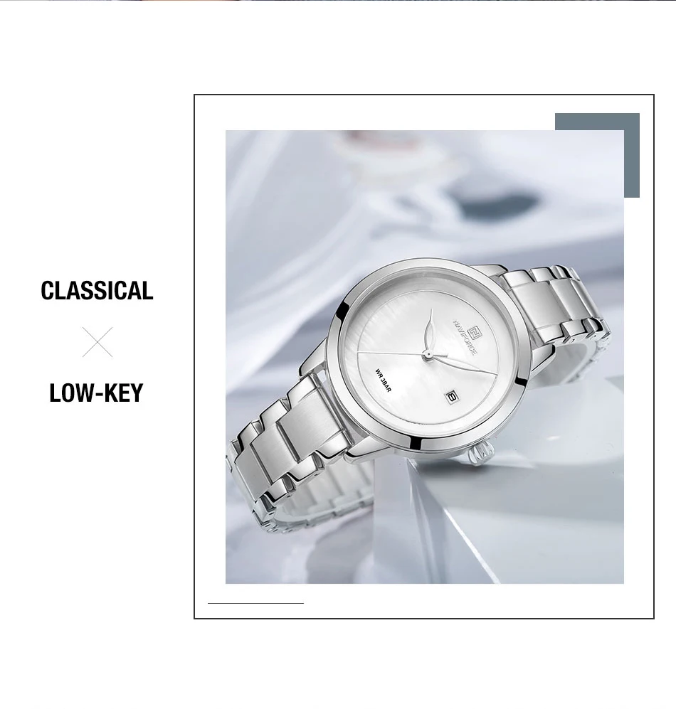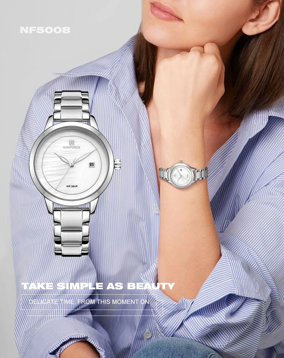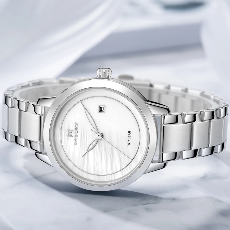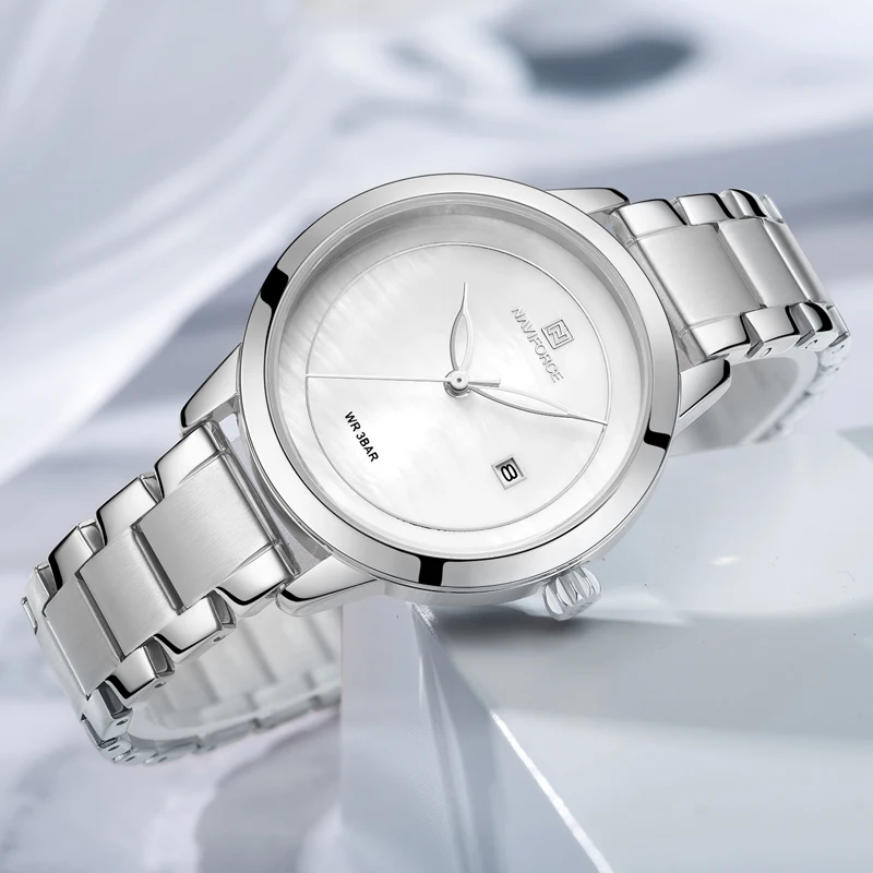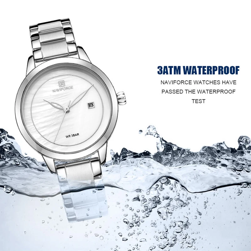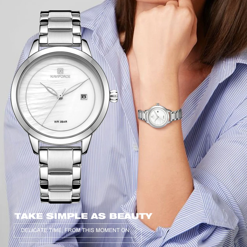 NAVIFORCE женские часы, лучший бренд, роскошные модные простые Серебристые белые кварцевые часы с датой, женские водонепроницаемые наручные часы, женские часы