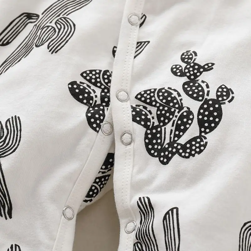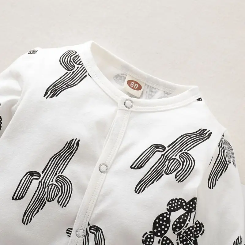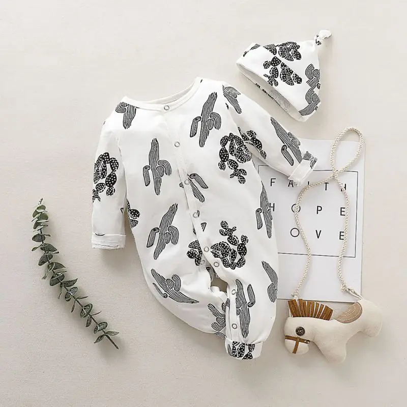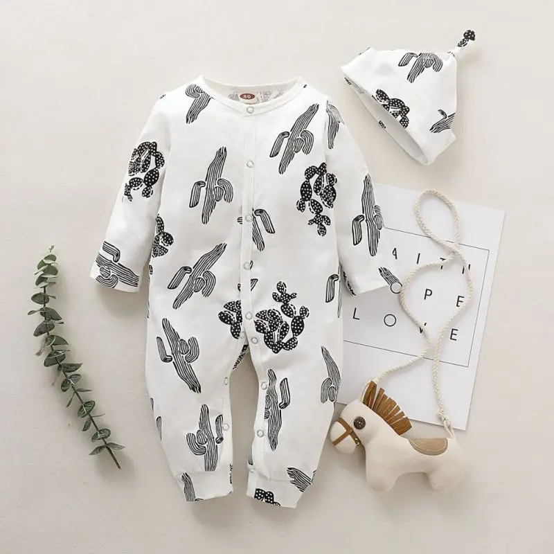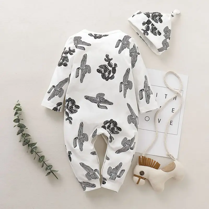 Одежда для малышей из 2 предметов комбинезон для новорожденных мальчиков и девочек с рисунком кактуса и шапочкой, комбинезон с длинными рукавами, хлопковый комплект одежды