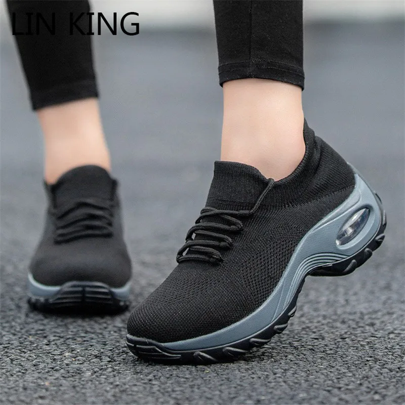 LIN KINGнескользящая женская обувь; Большие размеры 42; Кроссовки; Женская летняя спортивная обувь; Дышащие Трикотажные кроссовки на танкетке; Zapatillas Mujer