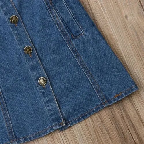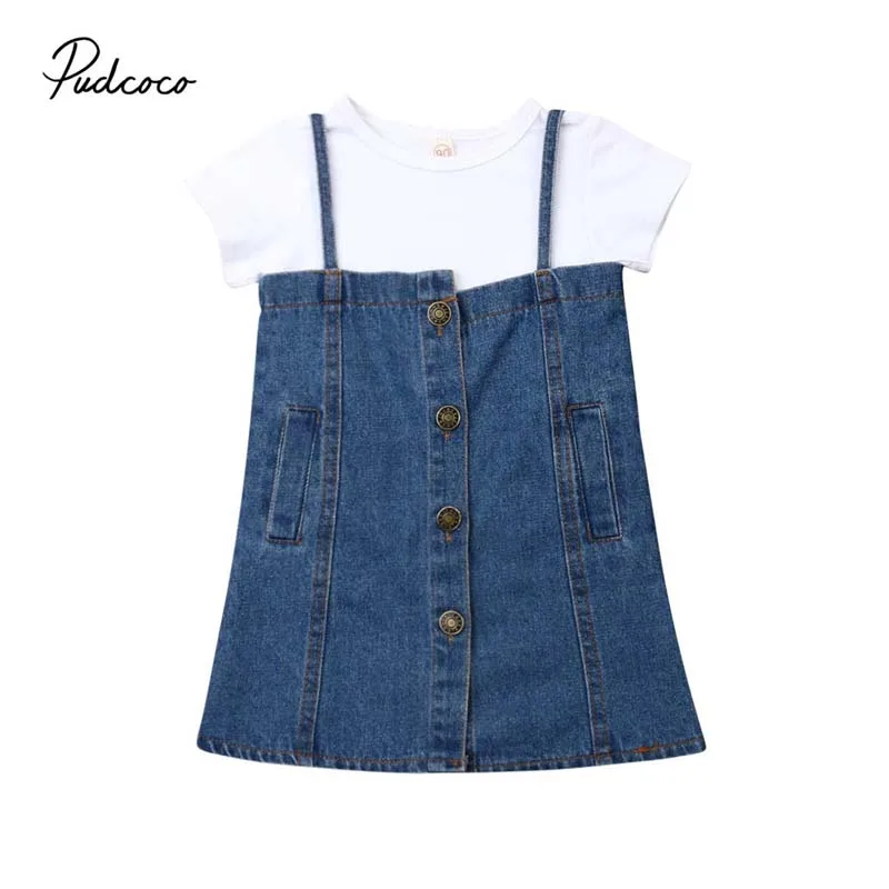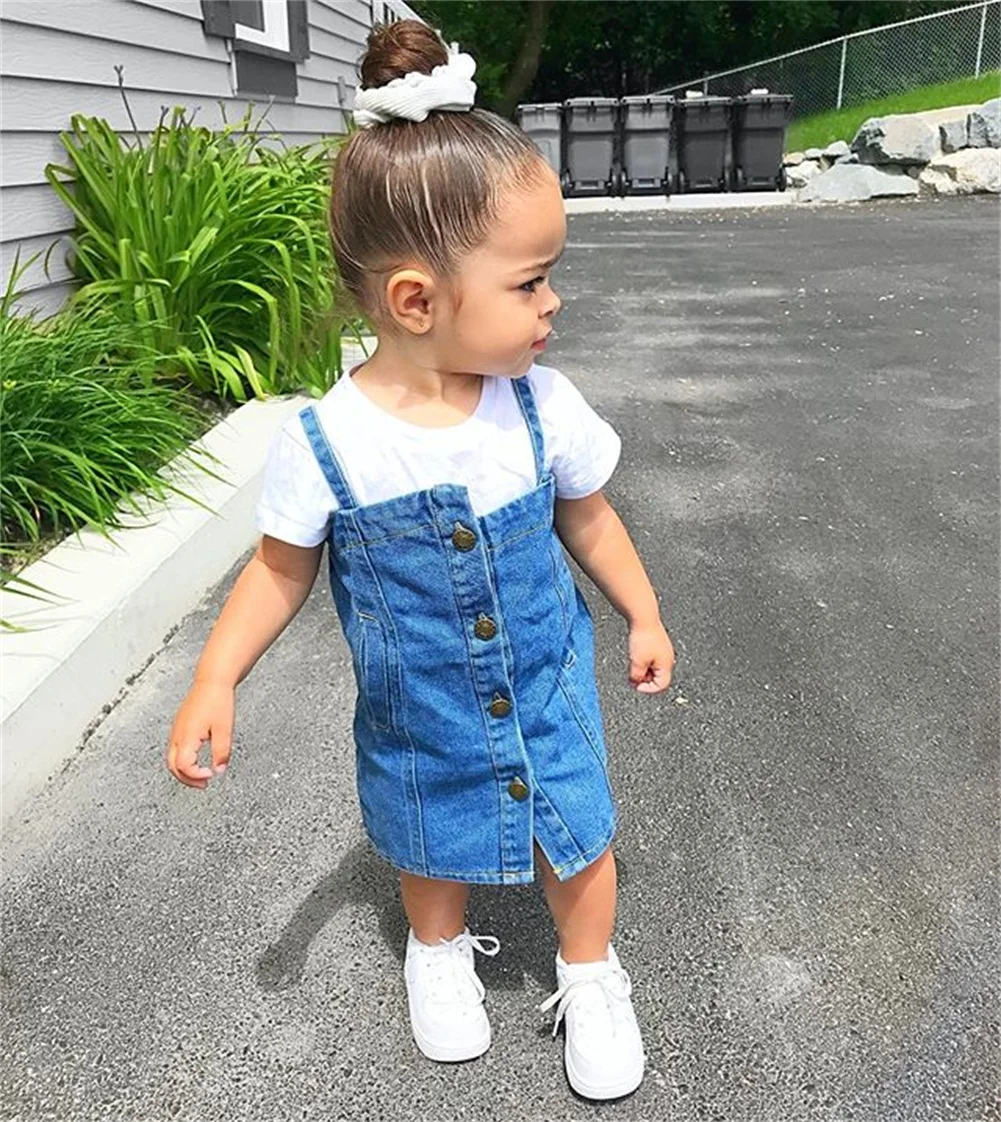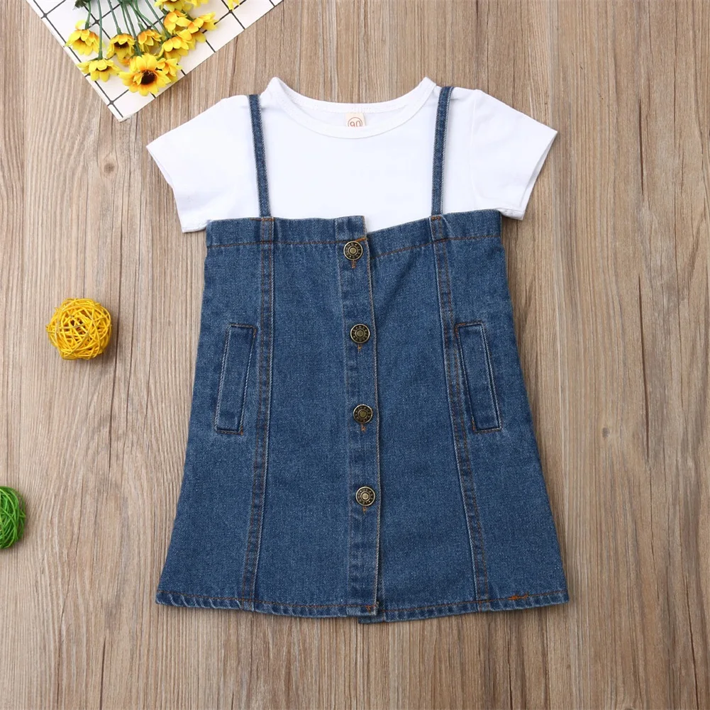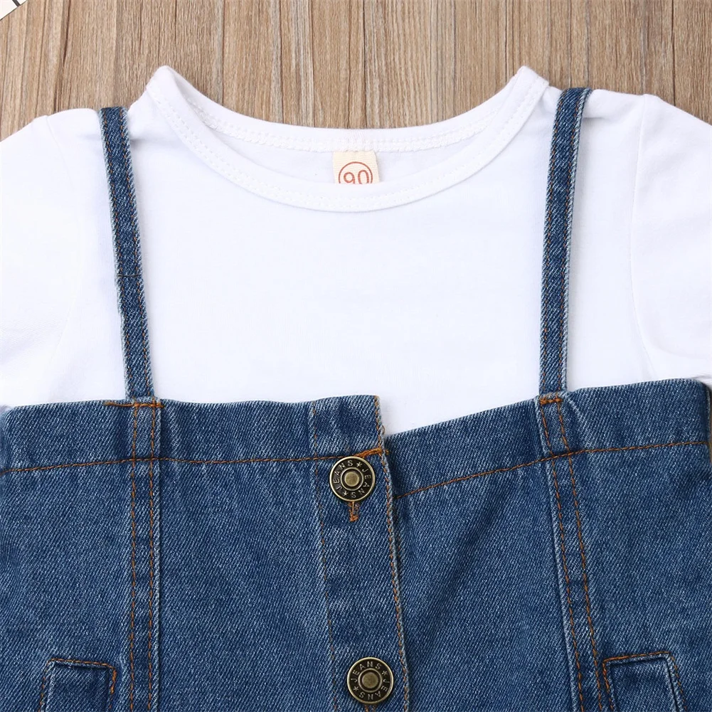 2019 летняя одежда для малышей, одежда для маленьких девочек, хлопковая рубашка из 2 предметов, джинсовое платье на бретелях, повседневная одежда
