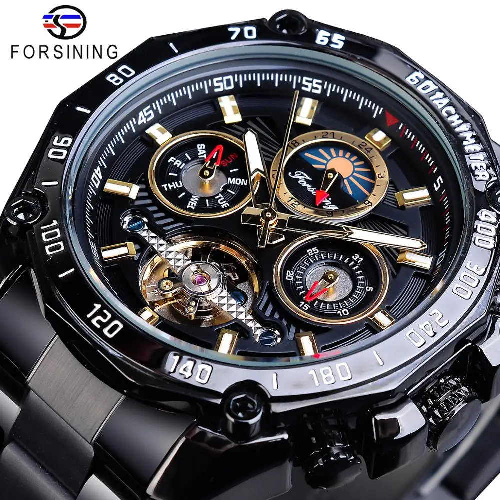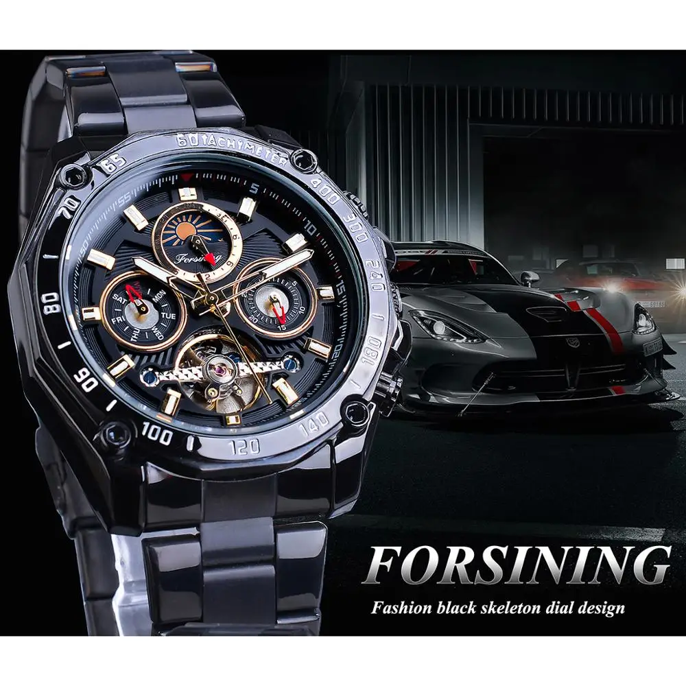 Часы наручные Forsining Мужские механические, Классические Автоматические Стальные Ремешки, с полым скелетоном, с автоматическим заводом, датой и лунными фазами, черные