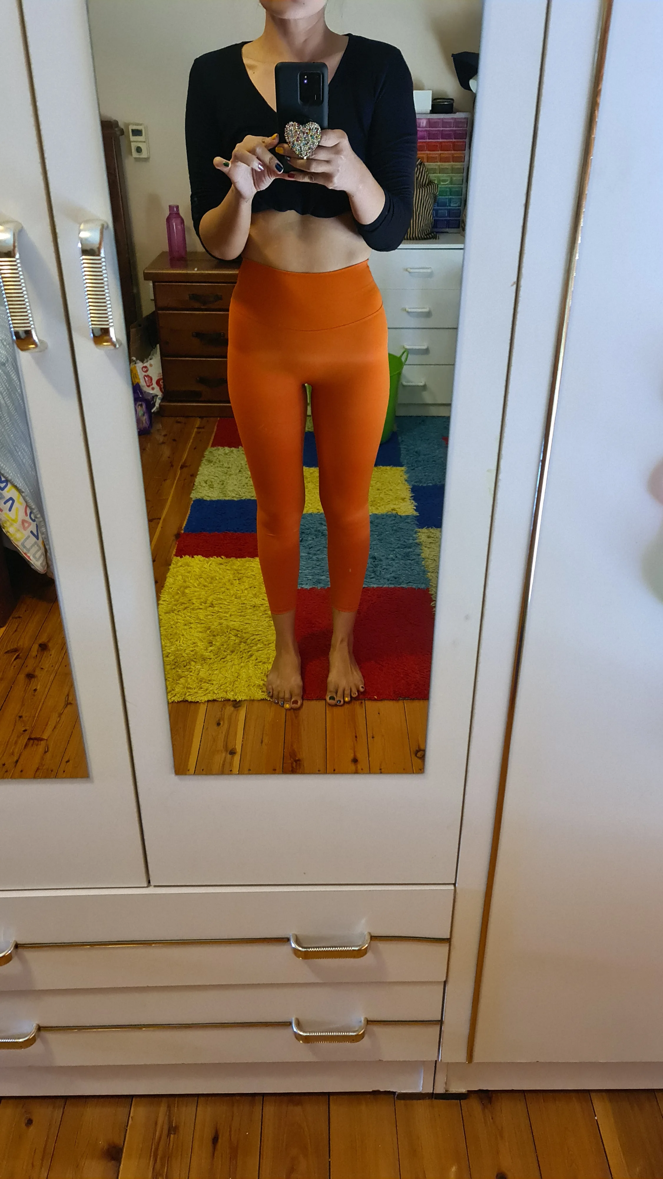Очень крутые лосины, пришли за полторы недели. Взяла на размер меньше, ношу XS - 156 см рост и длинна лосин по косточку, 45 кг, 60 см талия, 88 бедра. XXS идеально подошёл, очень приятная ткань, красиво лежит на животе и не передавливает.