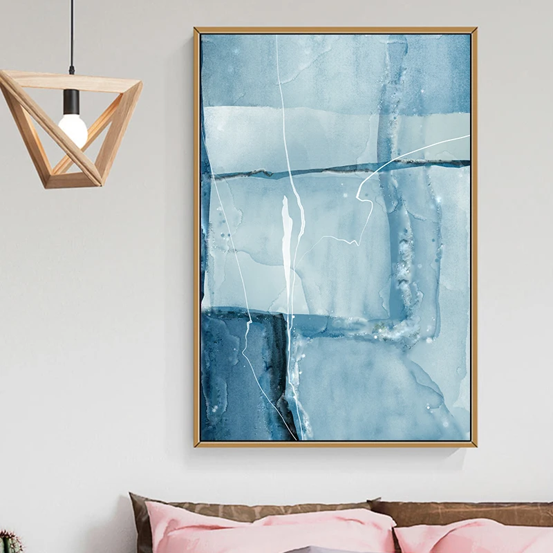 Скандинавская абстрактная цветная линия, синий холст, картина, плакат и печать, уникальный декор, настенные картины для гостиной, спальни