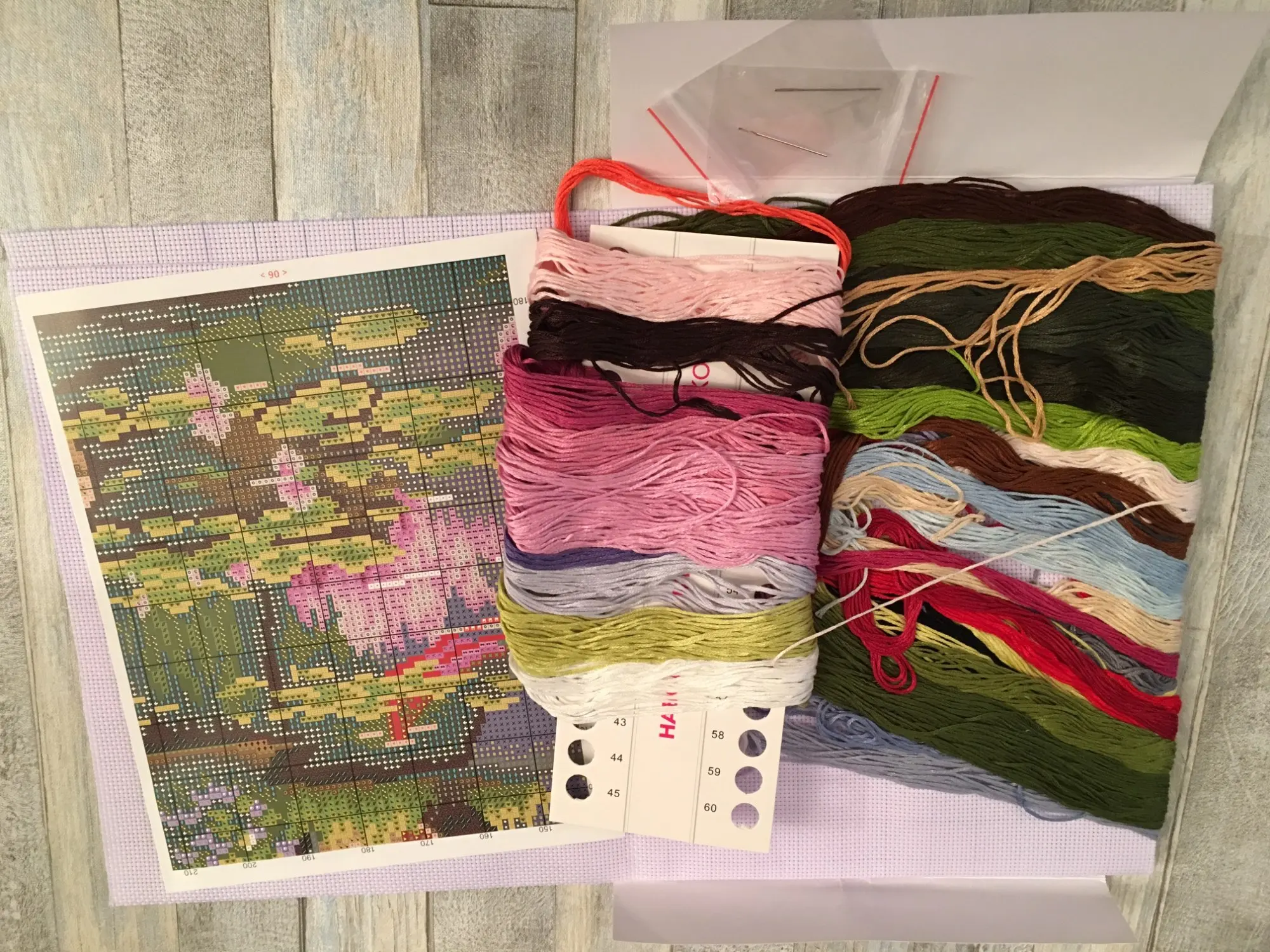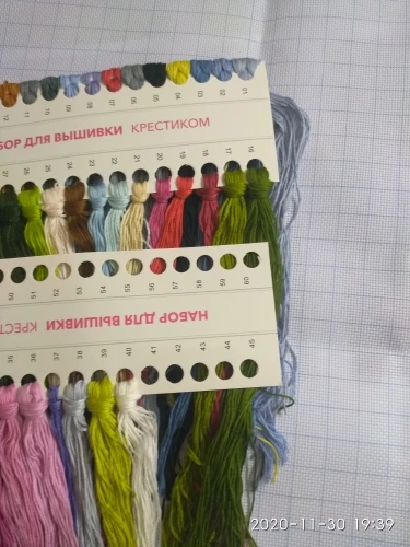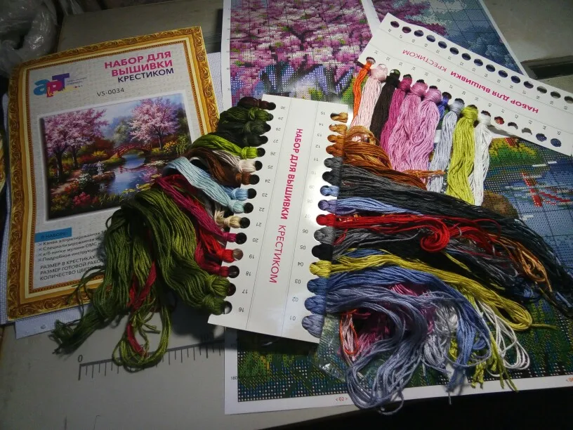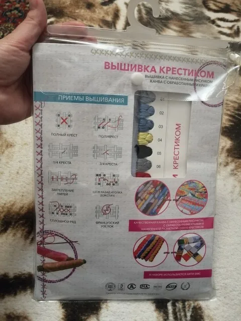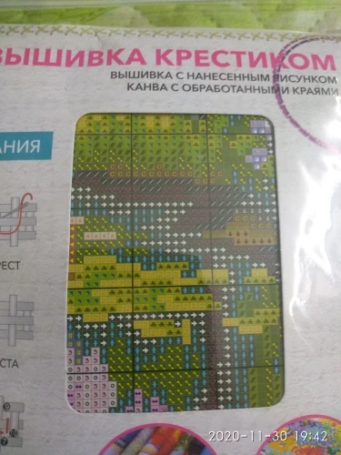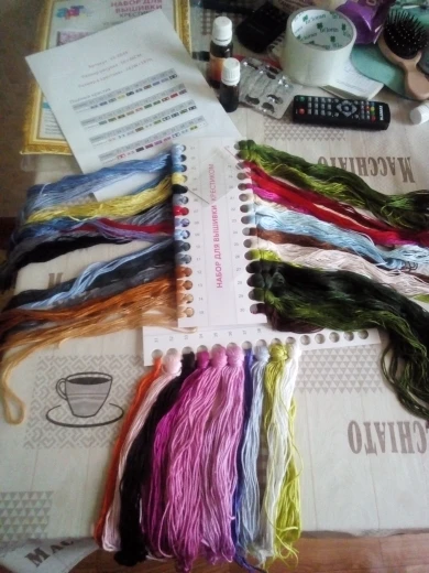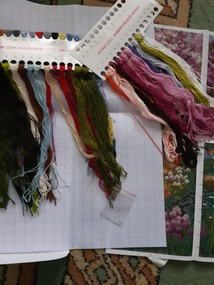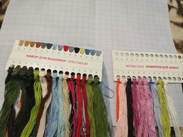 Заказала три набора. Пришли очень быстро, за что отдельное спасибо продавцу! Канава расчерчена на клеточки, но края не обработаны(((, что не совсем хорошо! В одном наборе на канве непонятные грязные пятна! Обидно! Надеюсь, что зашью и видно не будет. Ниток много, яркие, красивые.