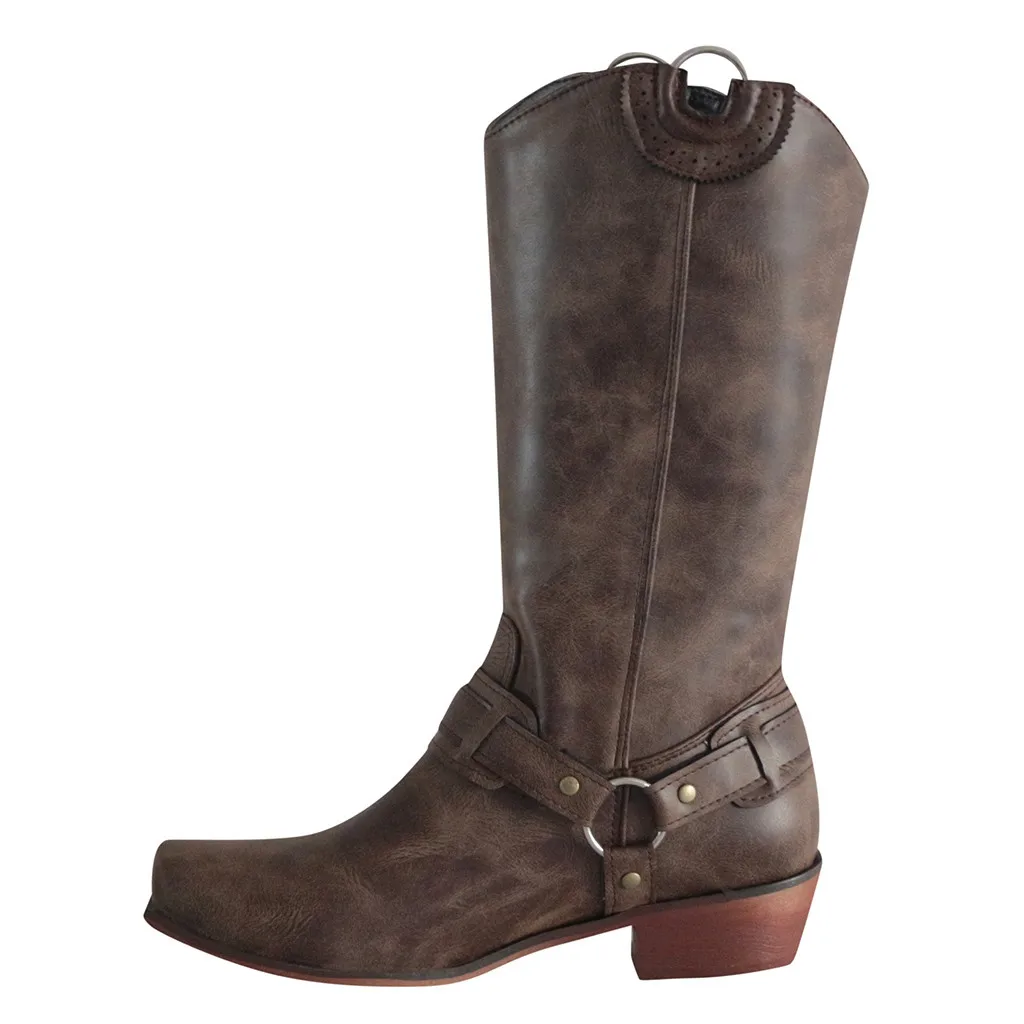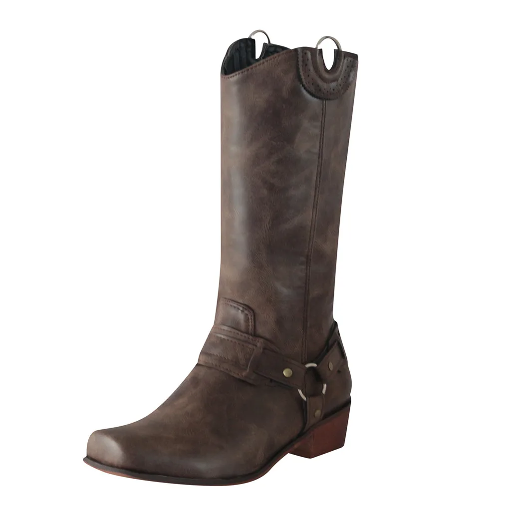Женские сапоги в западном стиле, зимние длинные сапоги-трубки в ретро-стиле, женские классические сапоги в римском стиле, на низком каблуке, винтажные ковбойские сапоги для верховой езды