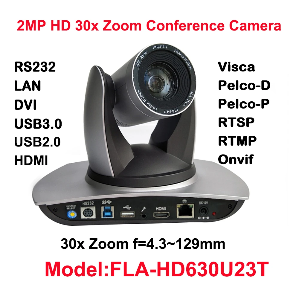 Номер модели: FLA-HD630U23T Камера параметр Оптический зум 30X f = 4,3 ~ 129 мм Сенсор 1/2.8 дюймов Высокое качество HD CMOS сенсор Эффективный Пиксели 16: 9, 2,07 мегапикселя Формат видеоU3:1920x1080P6 0/50/30/25; 1280x720P6 0/50/30/25;960x540P30