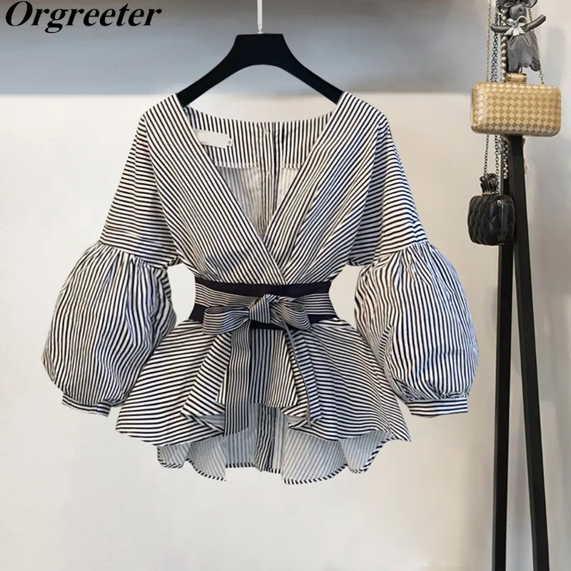 S-3XL элегантные ботинки из органической кожи Повседневная Блузка для женщин Новинка осени с длинным рукавом, с поясом, с бантом, с v-образным вырезом в полоску и с рисунками белая рубашка blusas mujer de moda 2019