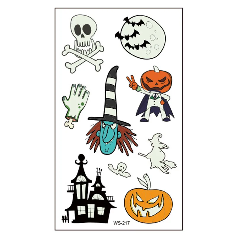 Временные наклейки для татуировки на Хэллоуин, водонепроницаемые светящиеся поддельные тату-Стикеры, паутина, тыква, летучая мышь, призрак, череп, временные татуировки