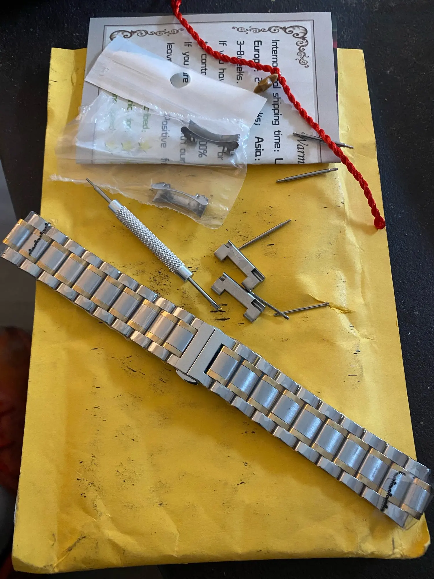 Все отлично! Офигенный браслет! Тяжелый. На мои винтажные Seiko 5 встал как родной. Быстрая доставка. Отслеживался от начала и до конца. Запасные шпильки ушек, изогнутые и прямые оконцовки браслета, приспособление для регулировки звеньев, и маленькое сердечко в подарок :))) 100% рекомендую.