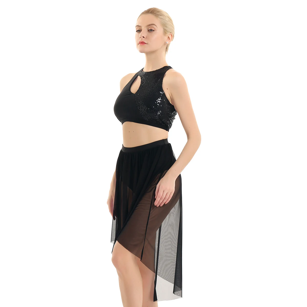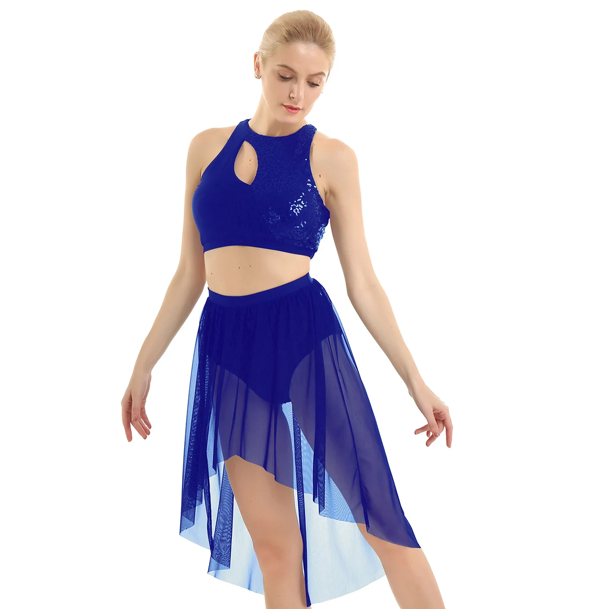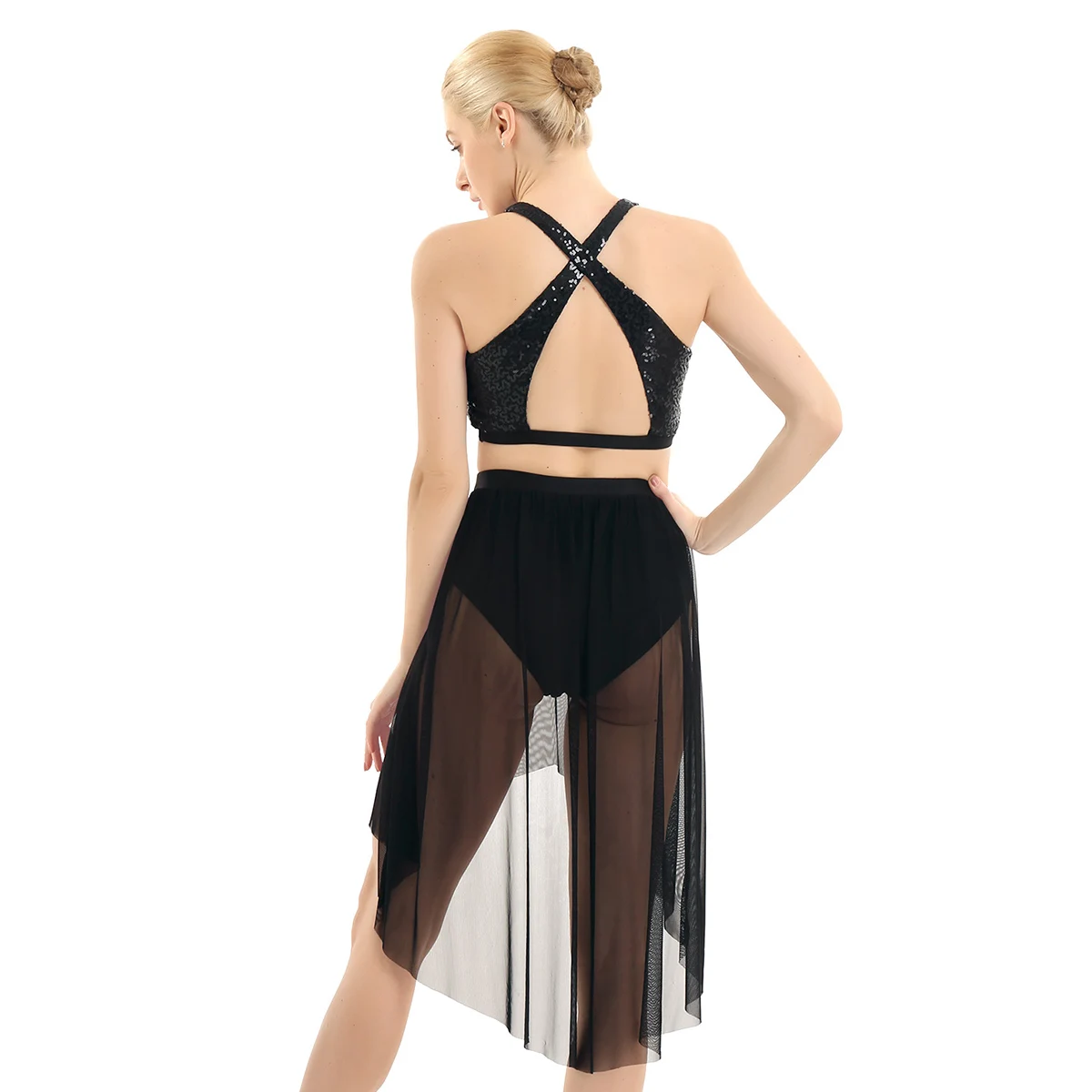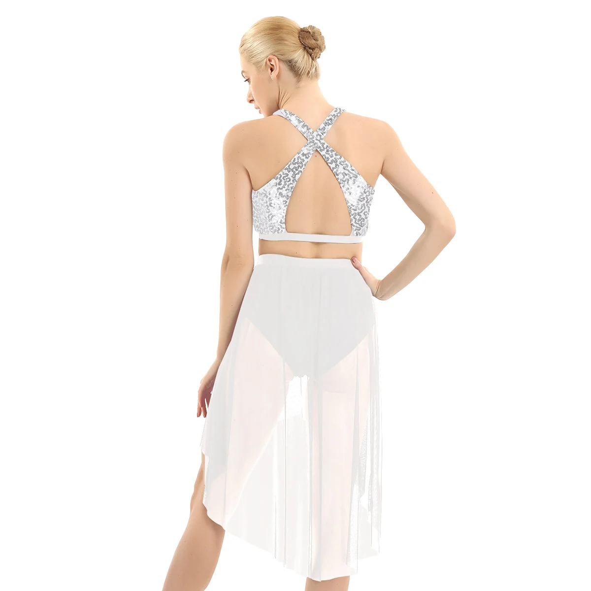 Ассиметричный Топ TiaoBug с блестками и сеткой, трико с юбкой, Женский комплект для гимнастики, балета, костюмы для лирических танцев