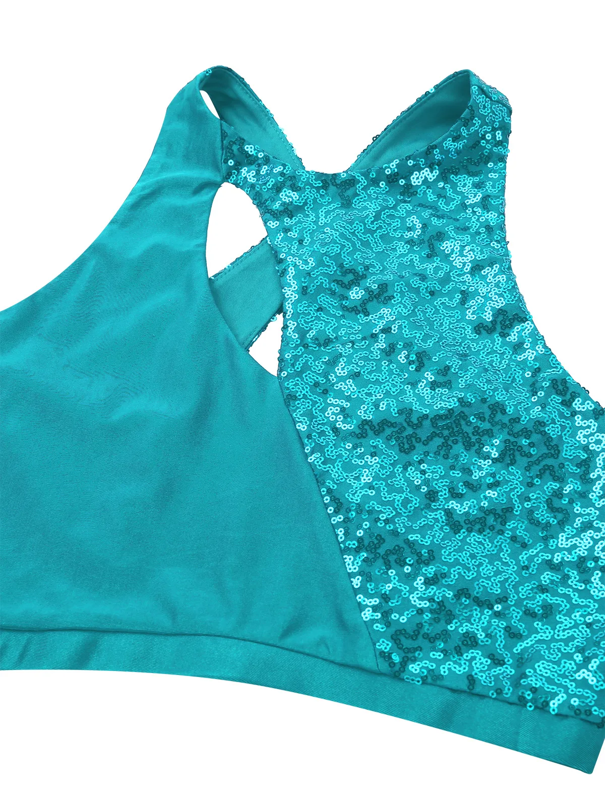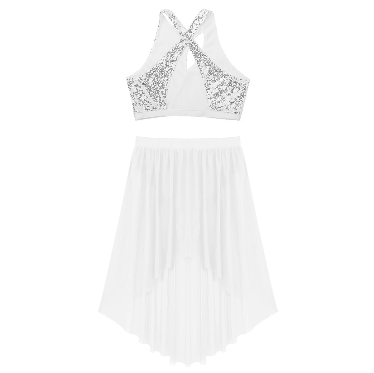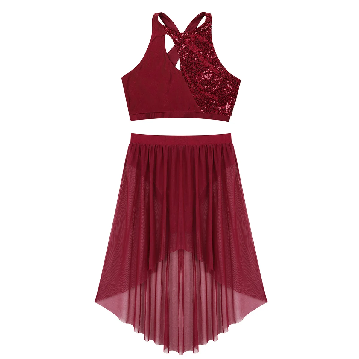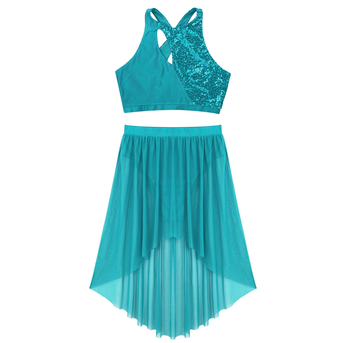 Ассиметричный Топ TiaoBug с блестками и сеткой, трико с юбкой, Женский комплект для гимнастики, балета, костюмы для лирических танцев