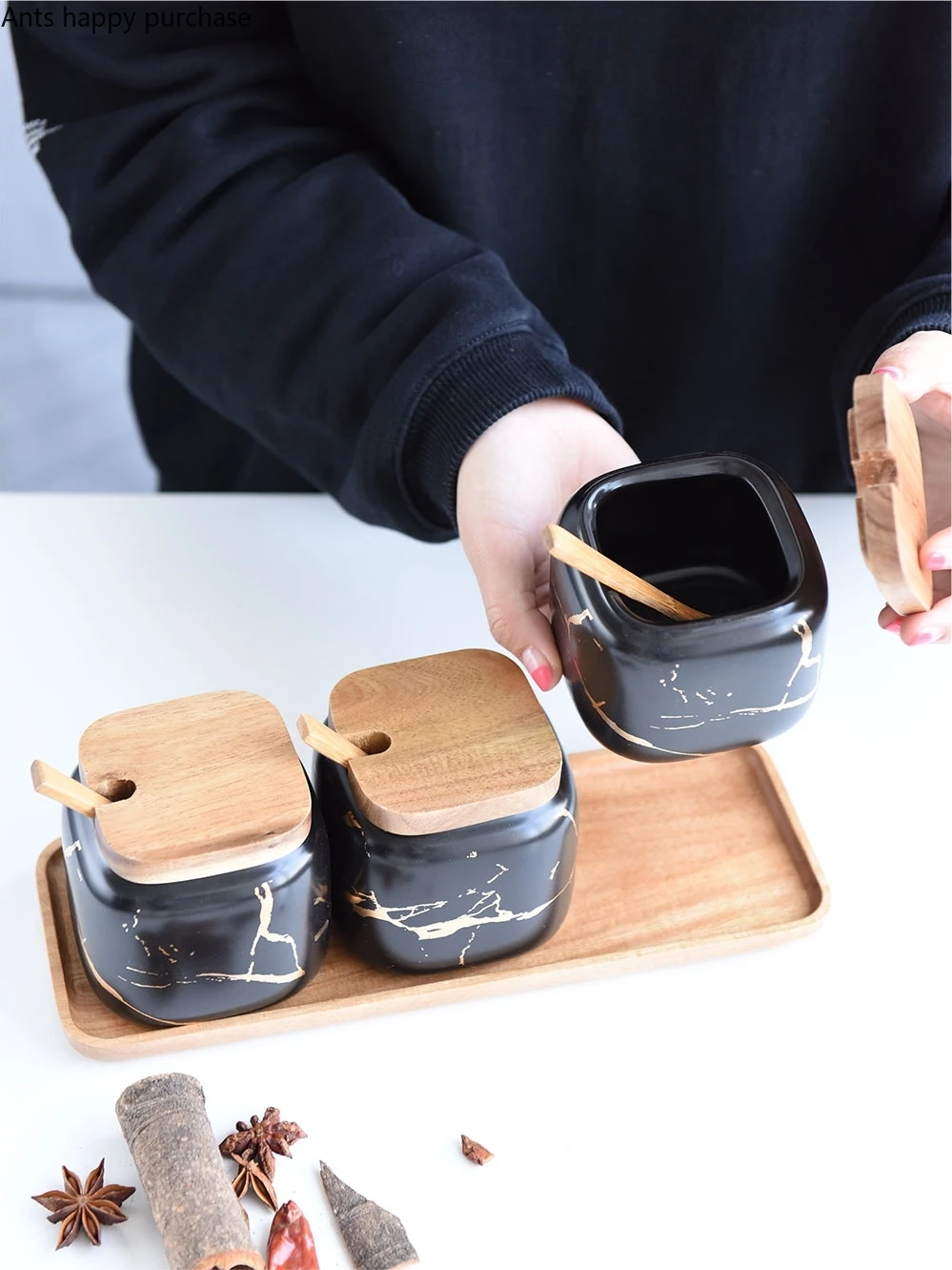 Креативный набор для приправ в скандинавском стиле, керамика, Золотой Мрамор, бак с крышкой, ложка, деревянные поддоны, бытовая кухонная соль, сахар