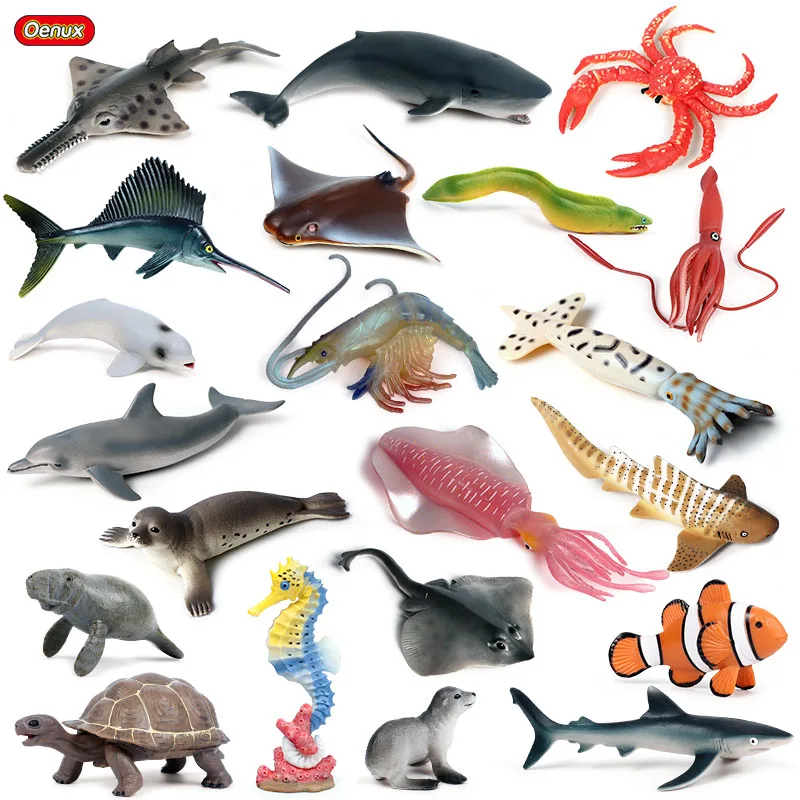 Характеристика:Oenux морские животные Дельфин кальмар креветка Краб Акула Модель черепахи фигурки Sealife аквариум миниатюрные Развивающие игрушки для детей