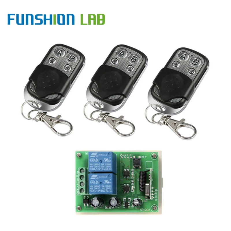 Беспроводной Радиочастотный переключатель FUNSHION, 433 МГц, 12 в пост. Тока, 2 канала, радиочастотный релейный модуль приемника + 433 МГц, пульт дистанционного управления для двигателя постоянного тока, контроллер обратного управления