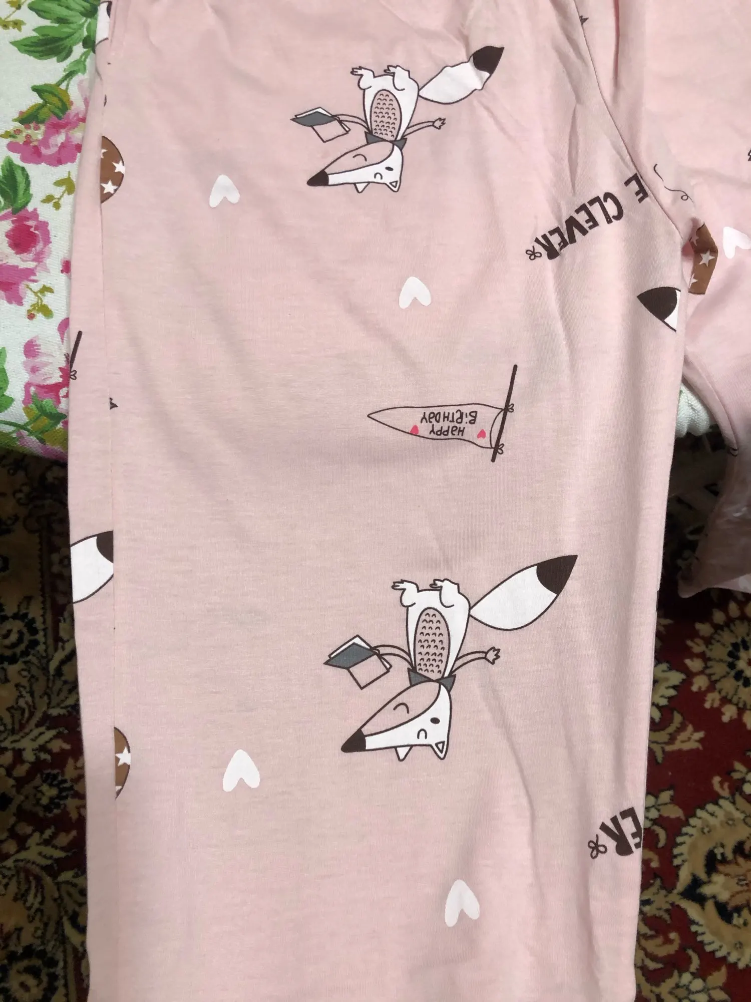 До Москвы посылка 3 недели. Материал тонкий.Сшито аккуратно. Цвет мне в итоге не понравился. На параметры объём талии 74 и объём бёдер 103 село свободно как я и хотела. Но вверх на 1,75 всё-таки коротковата. Ещё мне не понравилось что рисунки напечатанные как резиновым способом что ли. Раньше печатали на майках дешёвых прорезиненные рисунки. Вот также и на пижаме на ощупь неприятно. Теперь вопрос, будет ли трескаться или скатываться этот рисунок после стирки, узнаем только после нескольких стирок. Думала качество будет лучше.