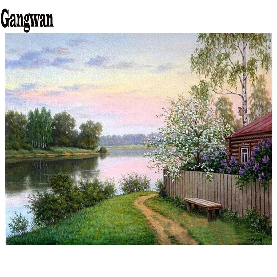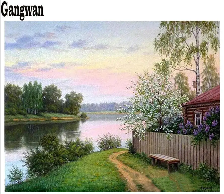 Алмазная вышивка Деревня и озеро, мозаика из натуральных страз, Набор для вышивки крестиком, украшение для дома