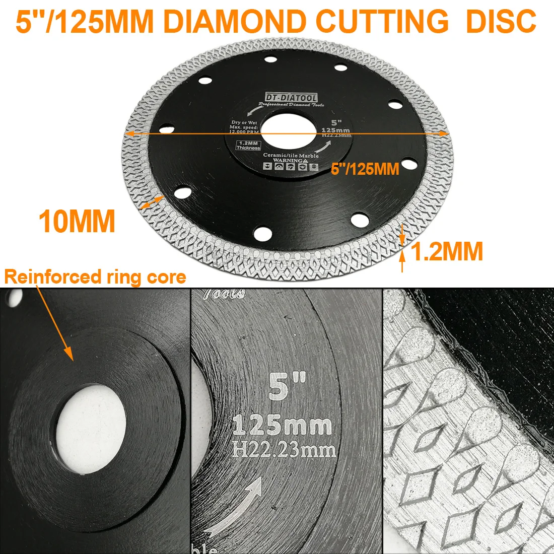 Диаметр 5 "/125 мм, отверстие 22,23 мм, высота алмаза 10 мм, Толщина сегмента 1,2 мм; Крупица #60/70.