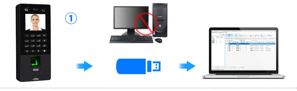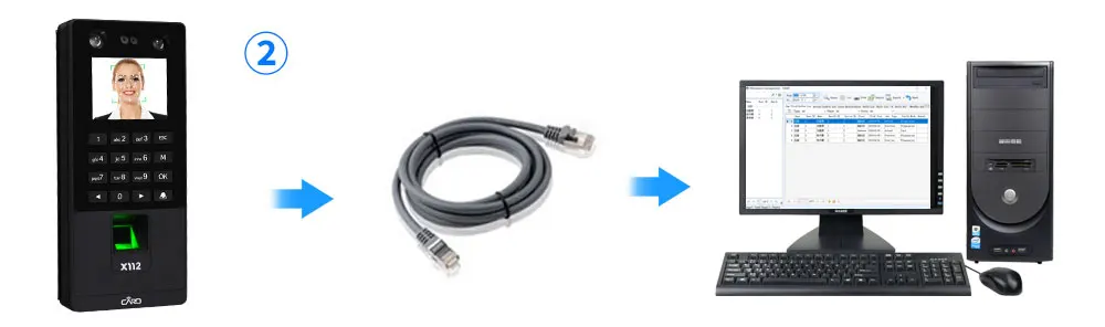 Это устройство поддерживает подключение к любому компьютеру через сеть связи TCP/IP. Поддерживает загрузку данных отчета о посещаемости одним нажатием непосредственно на компьютер. А также поддерживает использование U-диска для загрузки и загрузки.