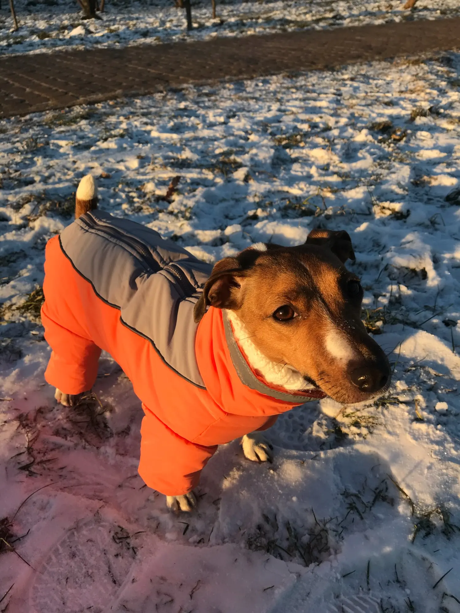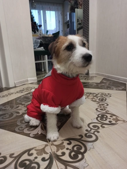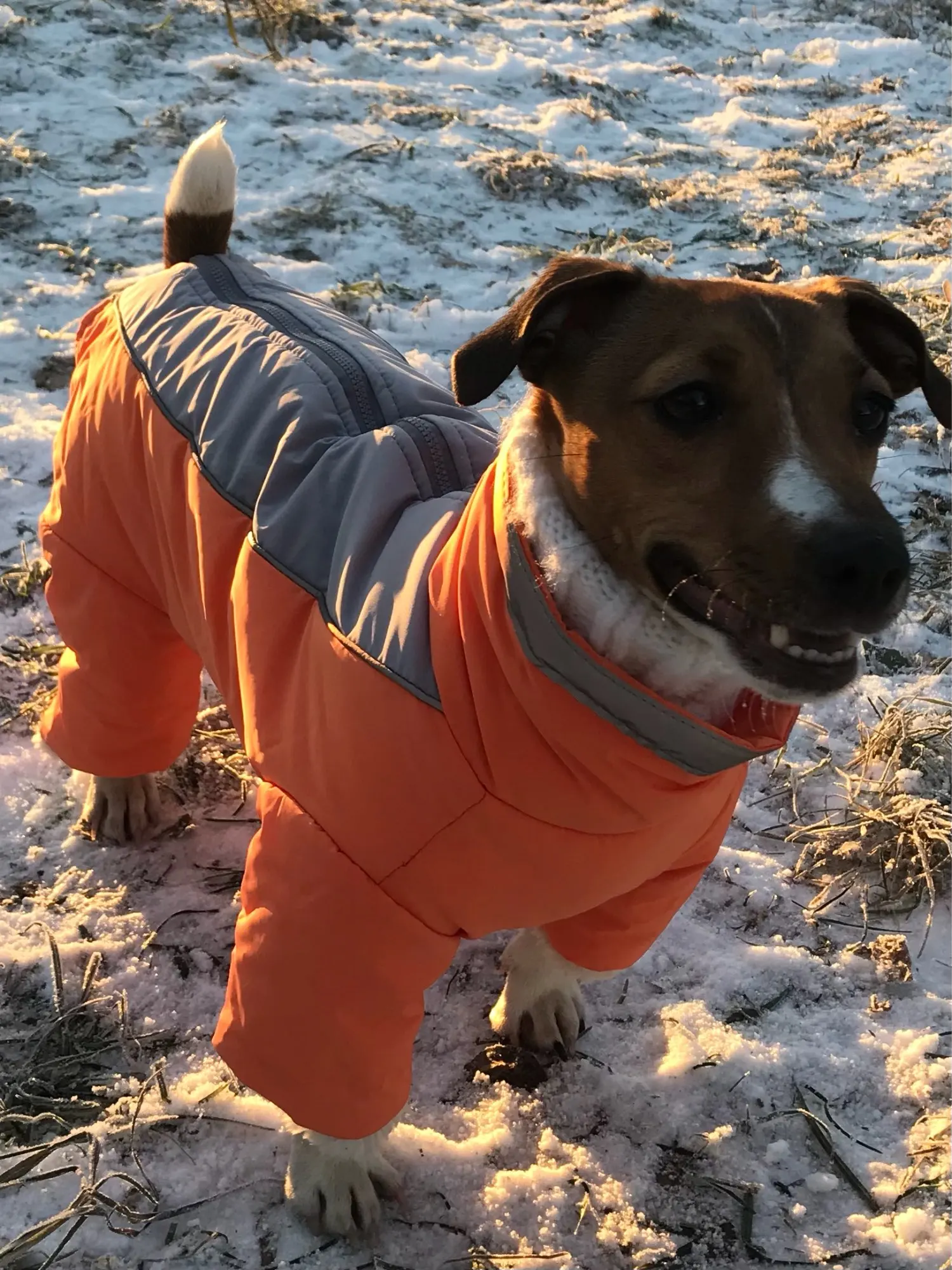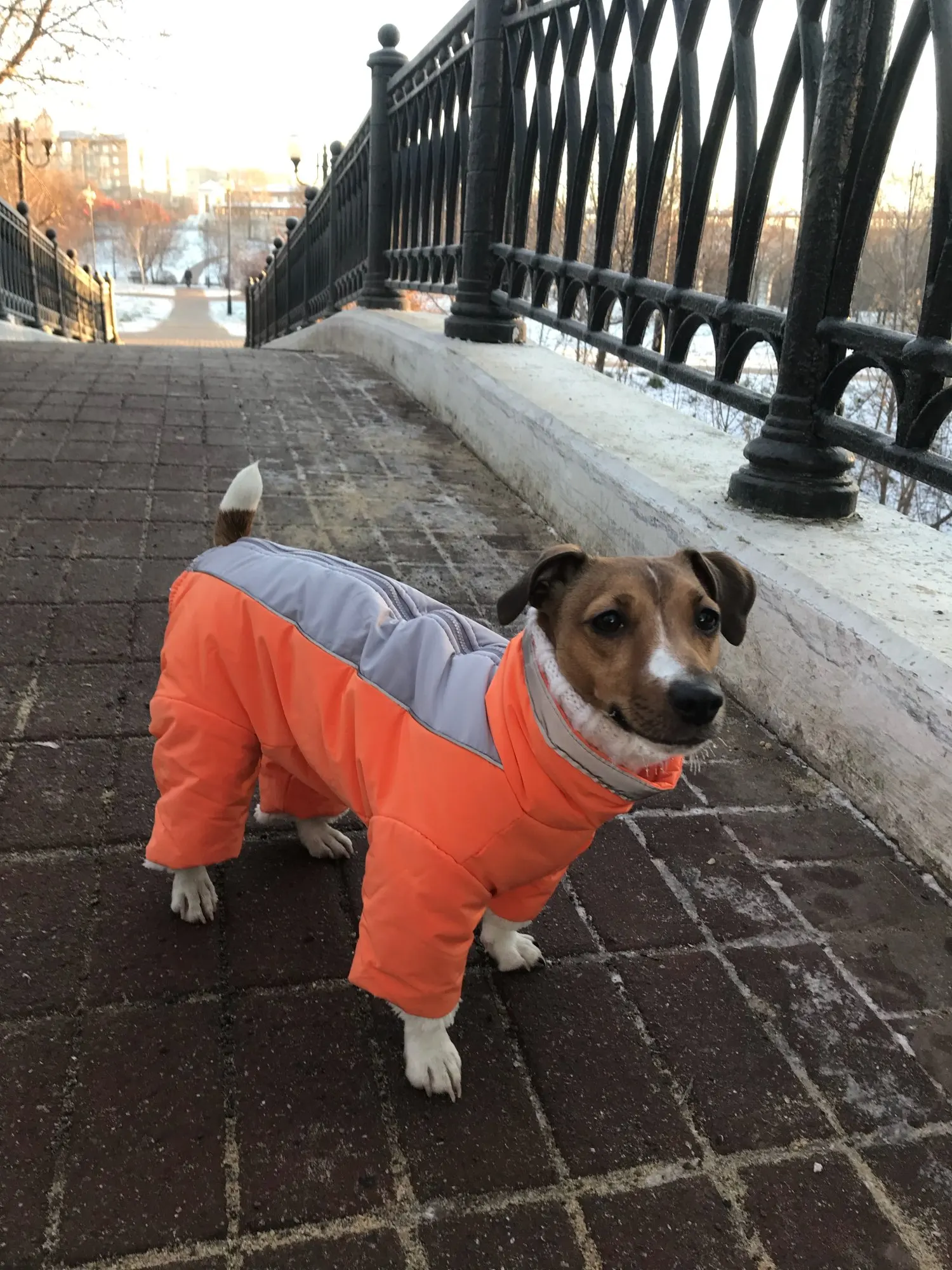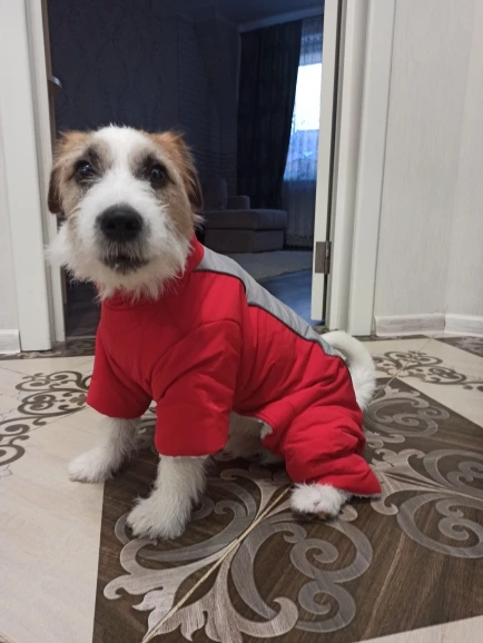 Хороший, качественный комбез. Есть светоотражающие элементы. Шёл, правда долго, но дошёл!!)) к сожалению, моей пятимесячной девочке Джек рассел терьера пока велик. Надеюсь на следующую зиму будет норм