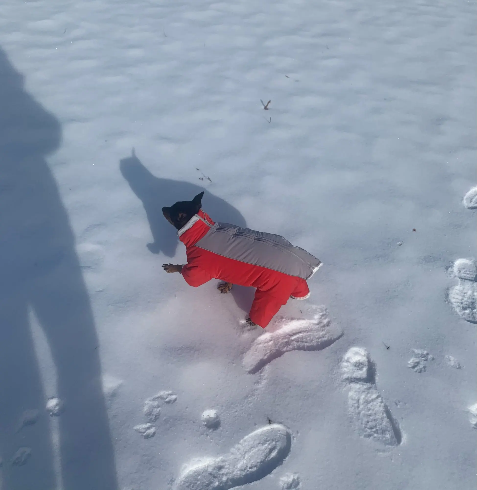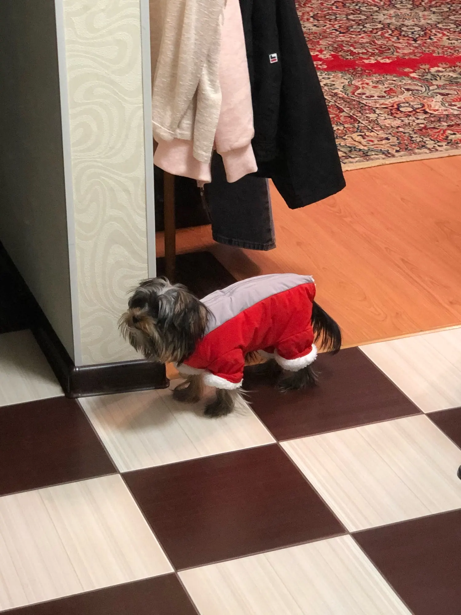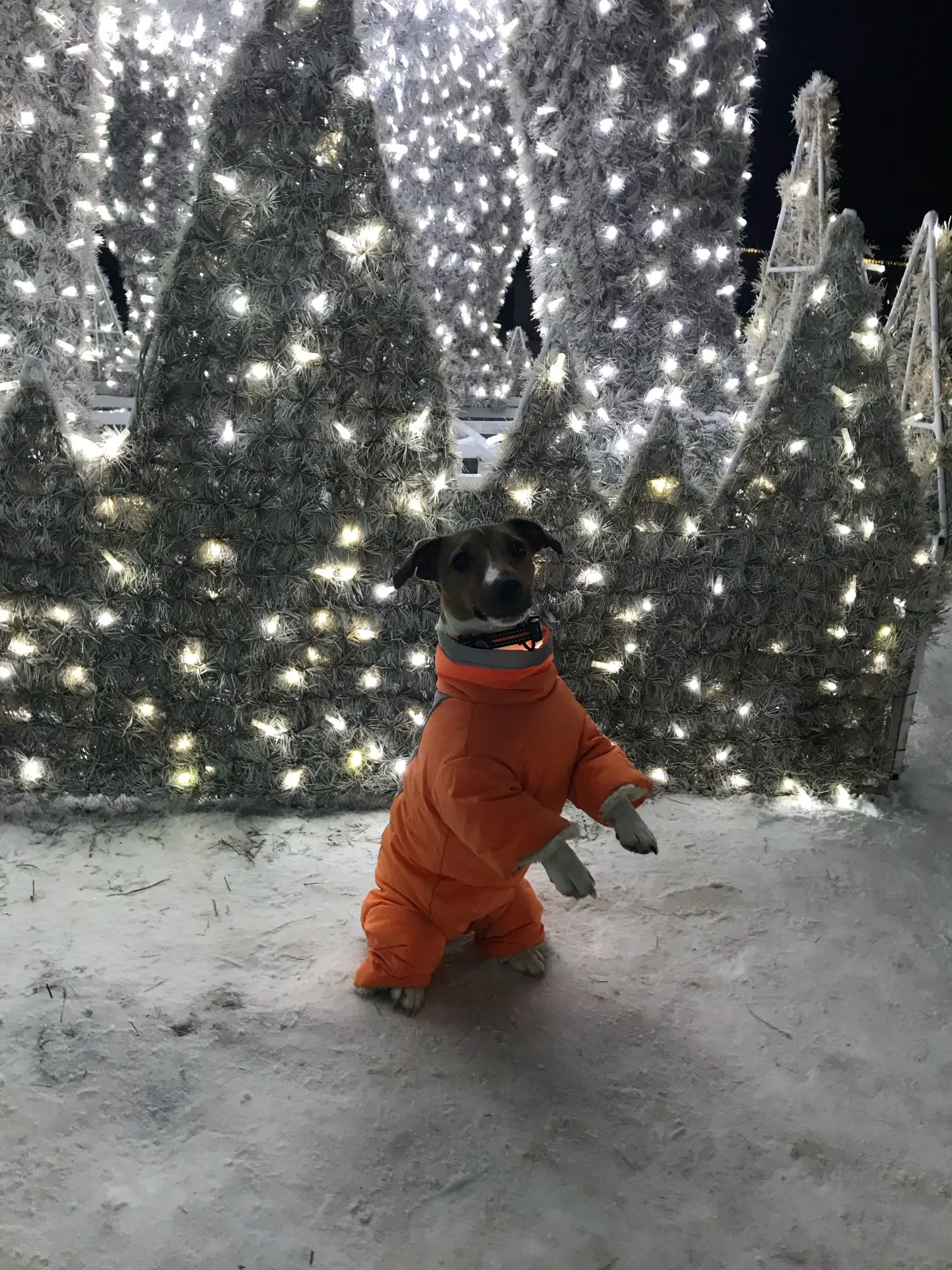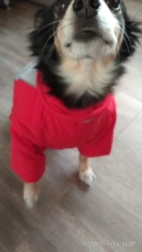 Хороший, качественный комбез. Есть светоотражающие элементы. Шёл, правда долго, но дошёл!!)) к сожалению, моей пятимесячной девочке Джек рассел терьера пока велик. Надеюсь на следующую зиму будет норм